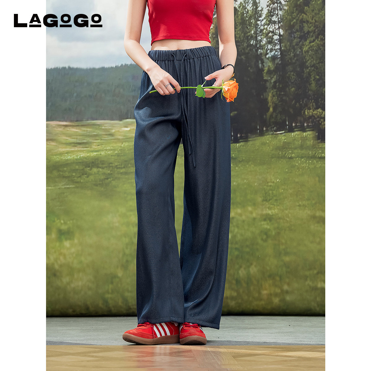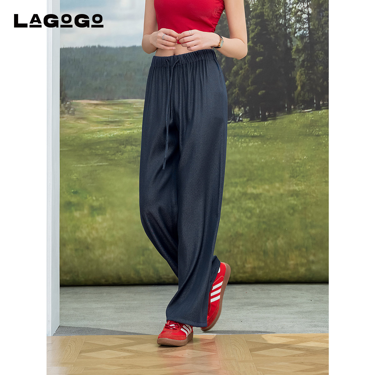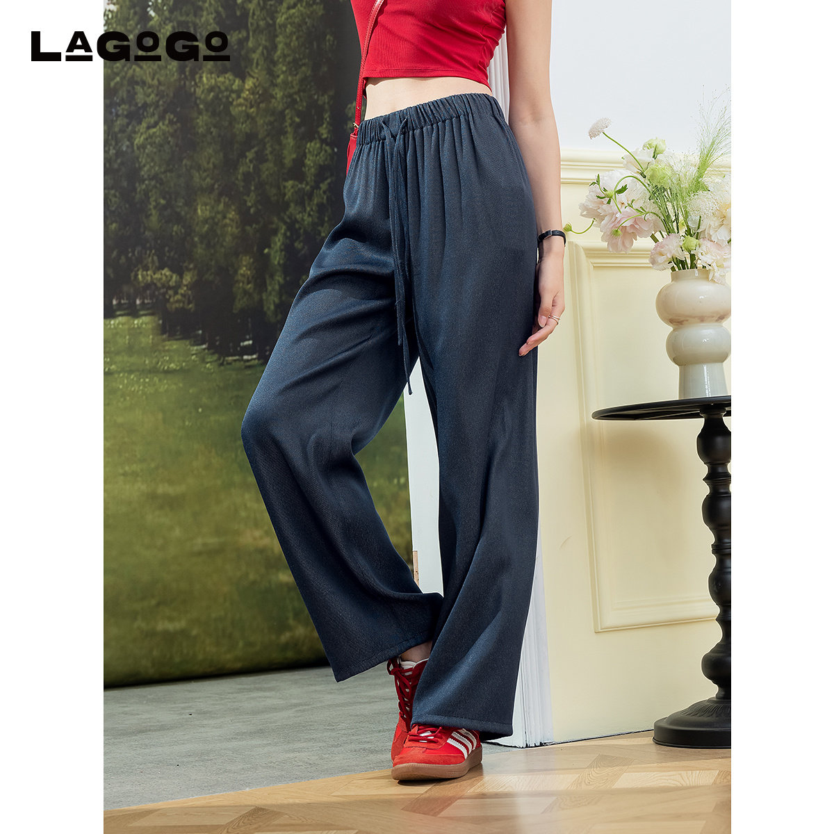 LAGOGO藏青色通勤百搭山本裤女拉谷谷夏季新款垂顺抽绳裤子