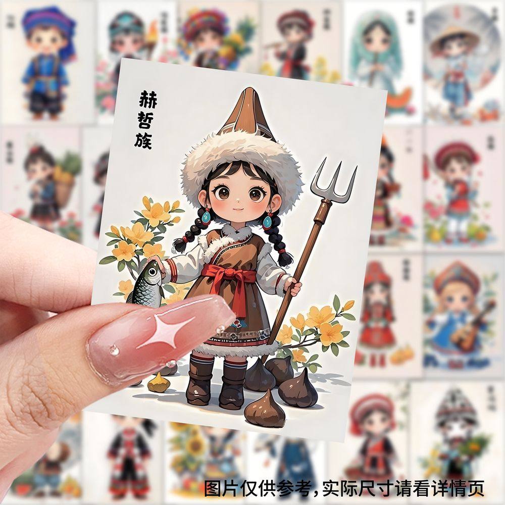 63张民族服饰贴纸中国民族风国潮卡通人物装饰水杯行李箱防水贴画