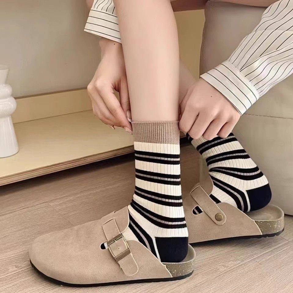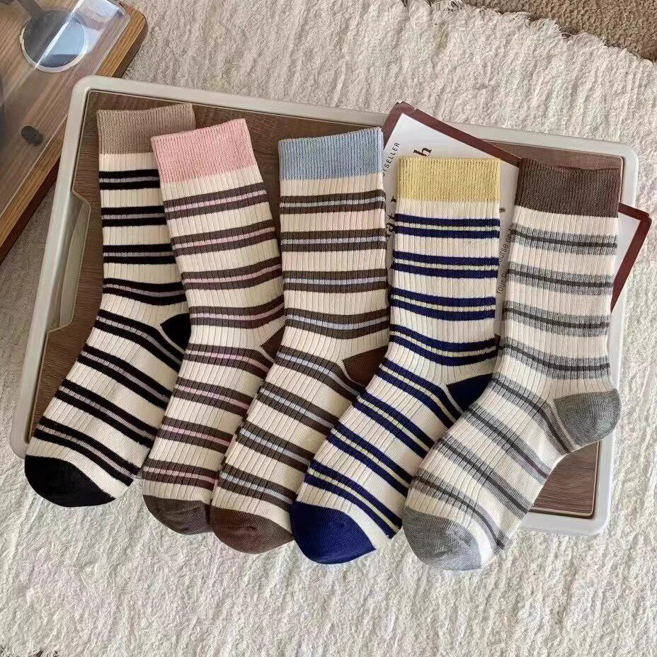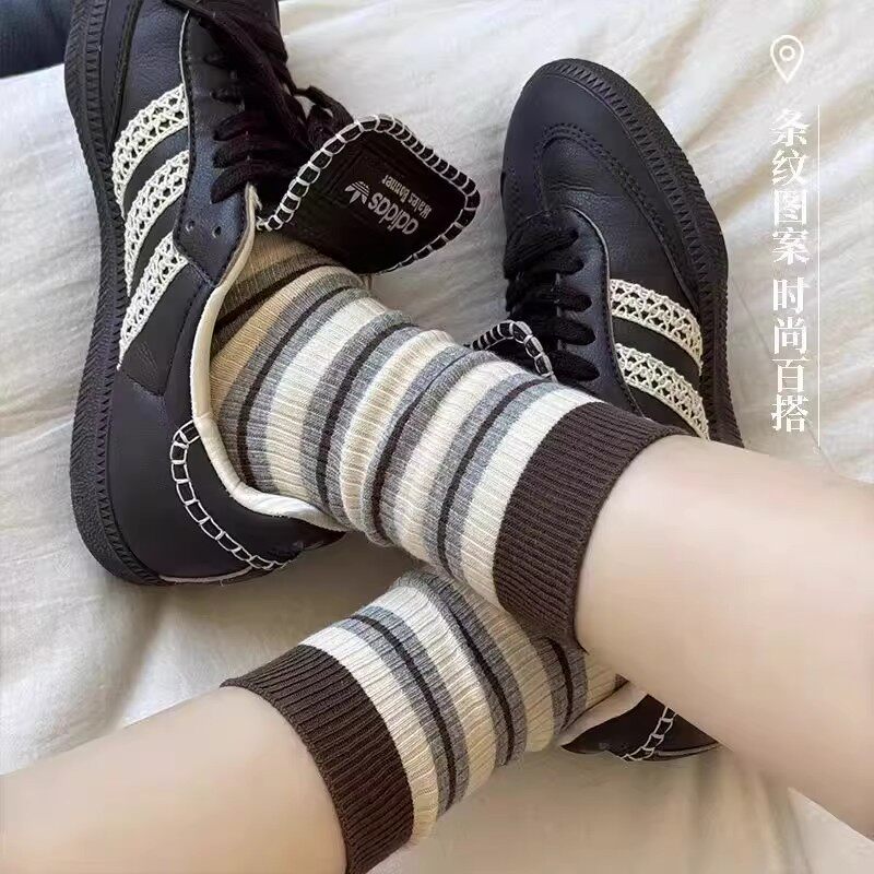 秋冬日系甜美可爱条纹棉长袜清新韩系简约百搭ins风花边女中筒袜