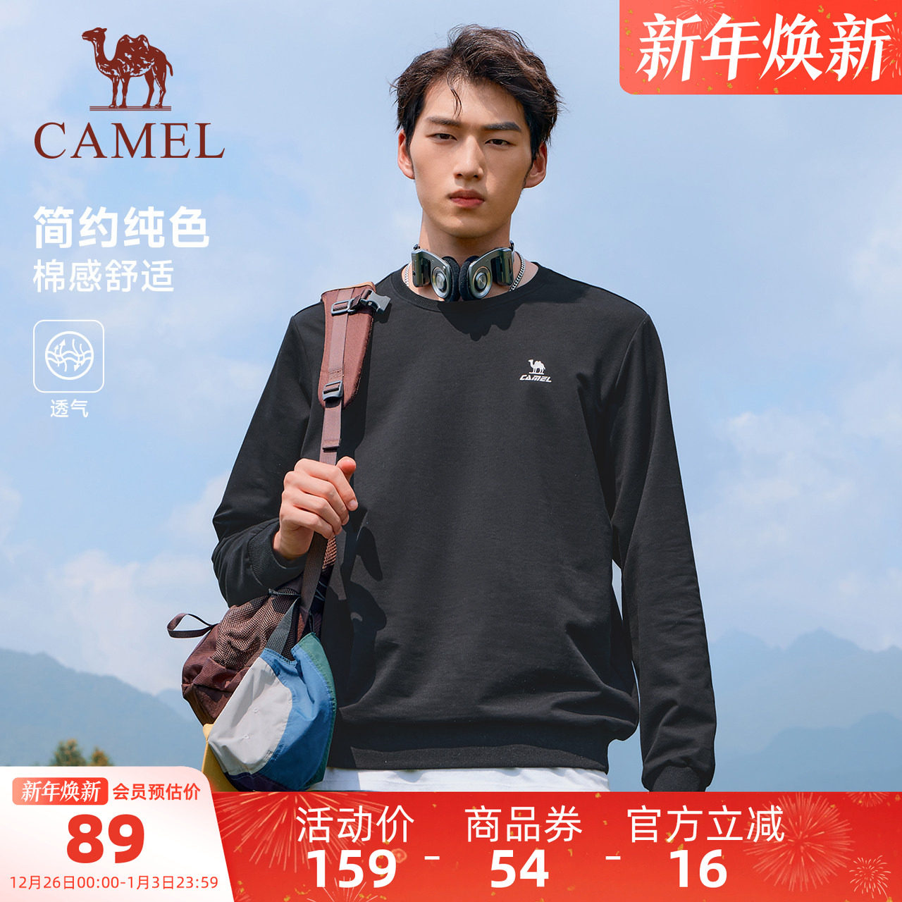 骆驼运动圆领套头卫衣男士宽松显瘦百搭薄款长袖打底衫休闲T恤女