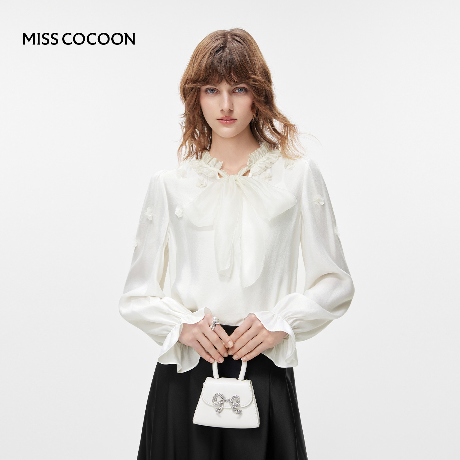 COCOBELLA名媛风手工压褶木耳边雪纺衬衫气质通勤飘带衬衣SR7062