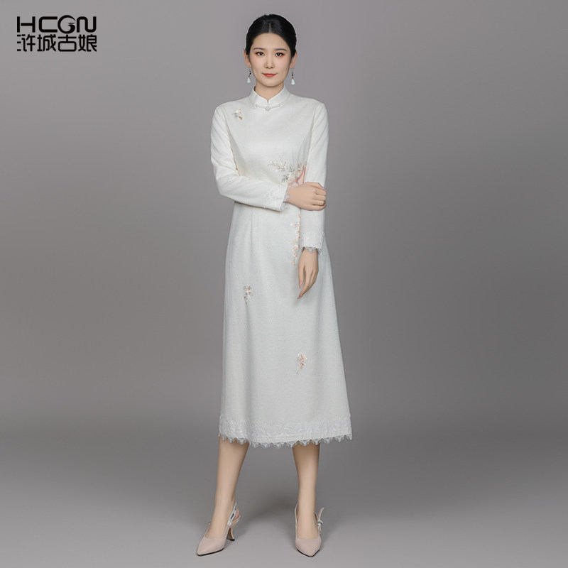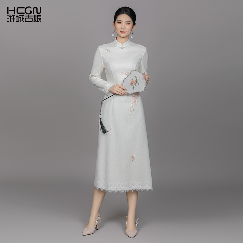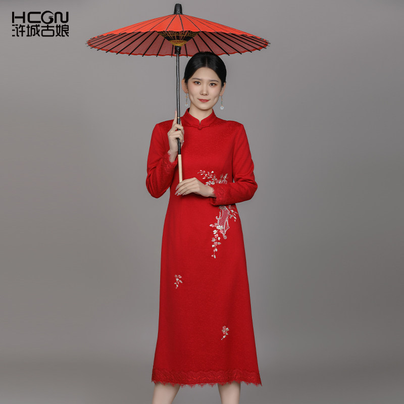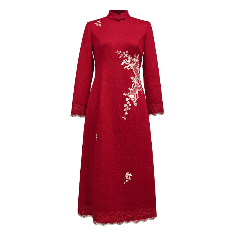 浒城古娘新款刺绣气质立领红色长袖新中式国风旗袍连衣裙女款春秋