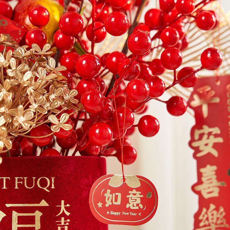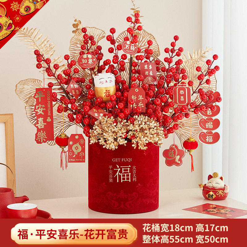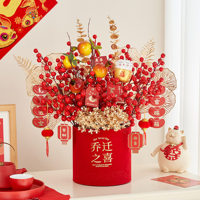 福桶发财果红果过年插花摆件装饰客厅结婚花束仿真年宵花乔迁入宅