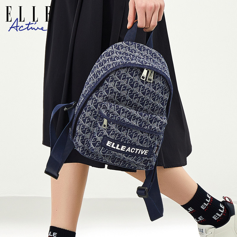 ELLE Active女包仿牛仔复古背包便携轻便满印字母提花休闲双肩包