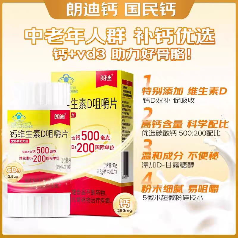 朗迪钙维生素D3咀嚼片100粒碳酸钙儿童钙片男女孕妇中老年人补钙