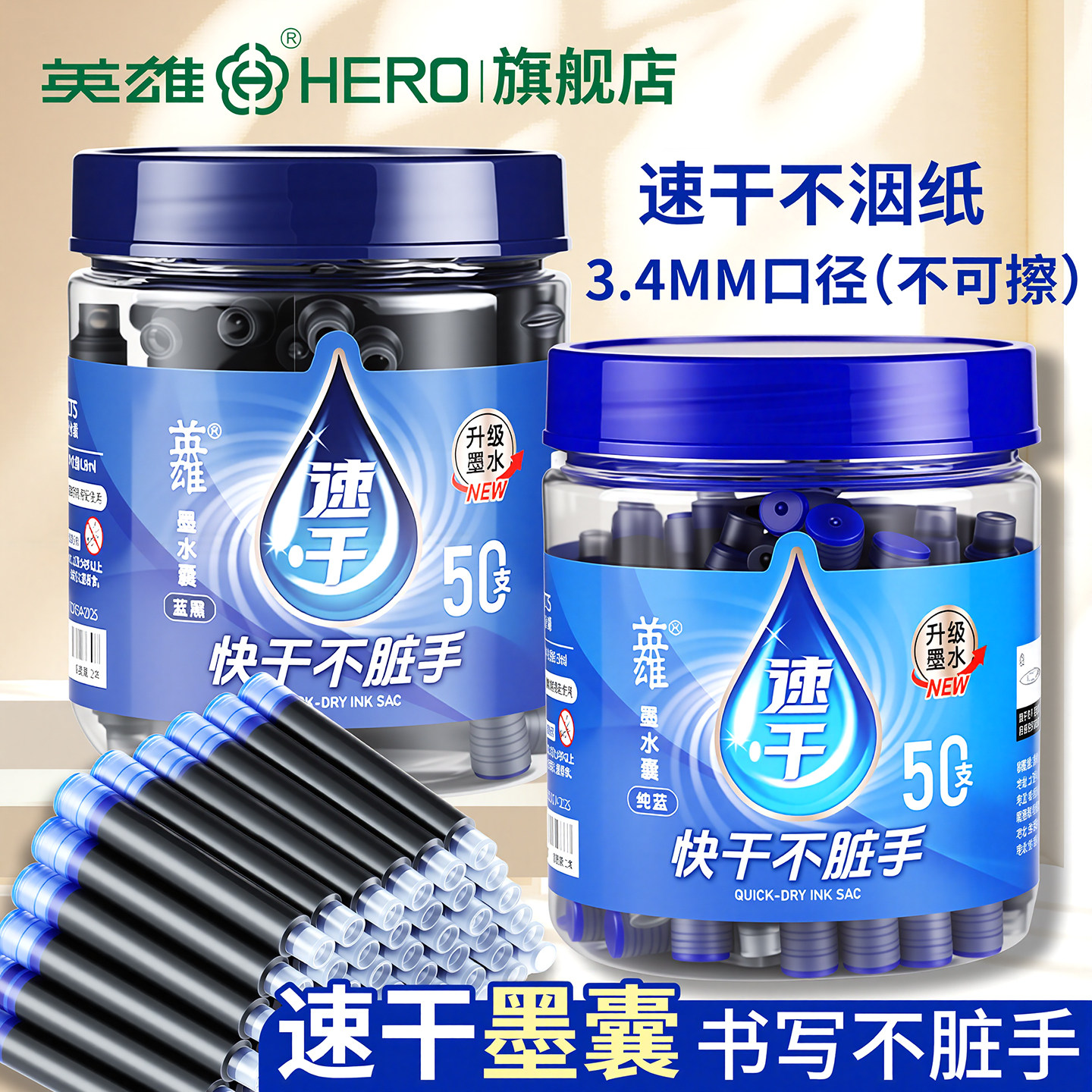 英雄牌速干墨囊3S左右干不脏手快干3.4mm口径替换墨囊芯官方旗舰店无异味非碳素墨水大容量学生钢笔