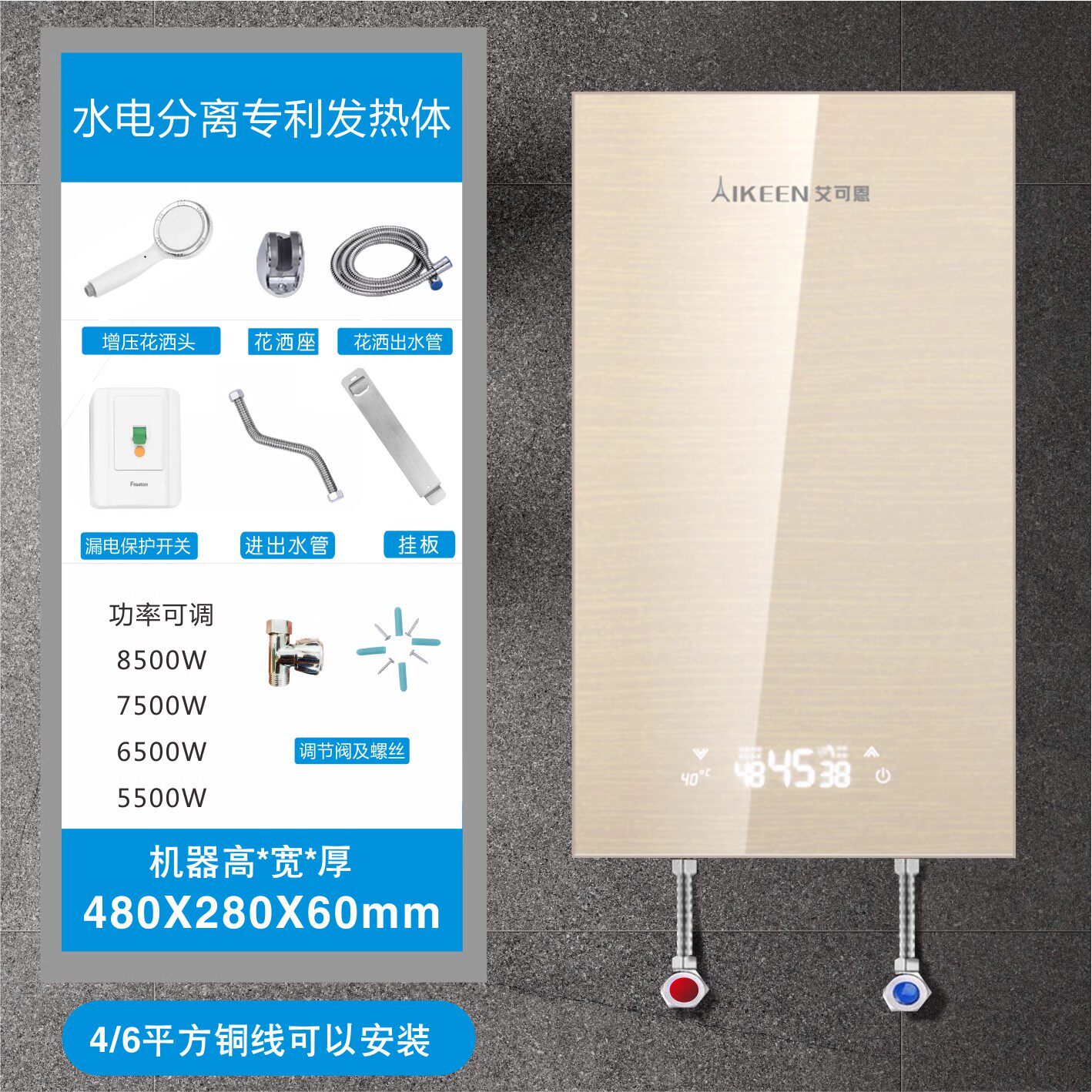 最高65度/发热体八年免费换新/内置双防电墙