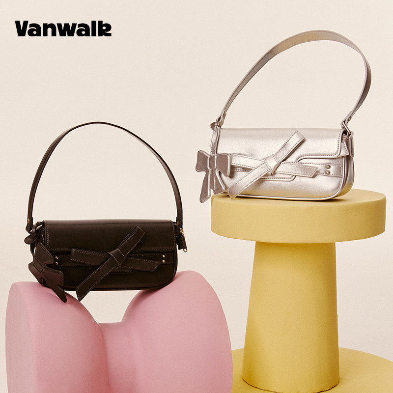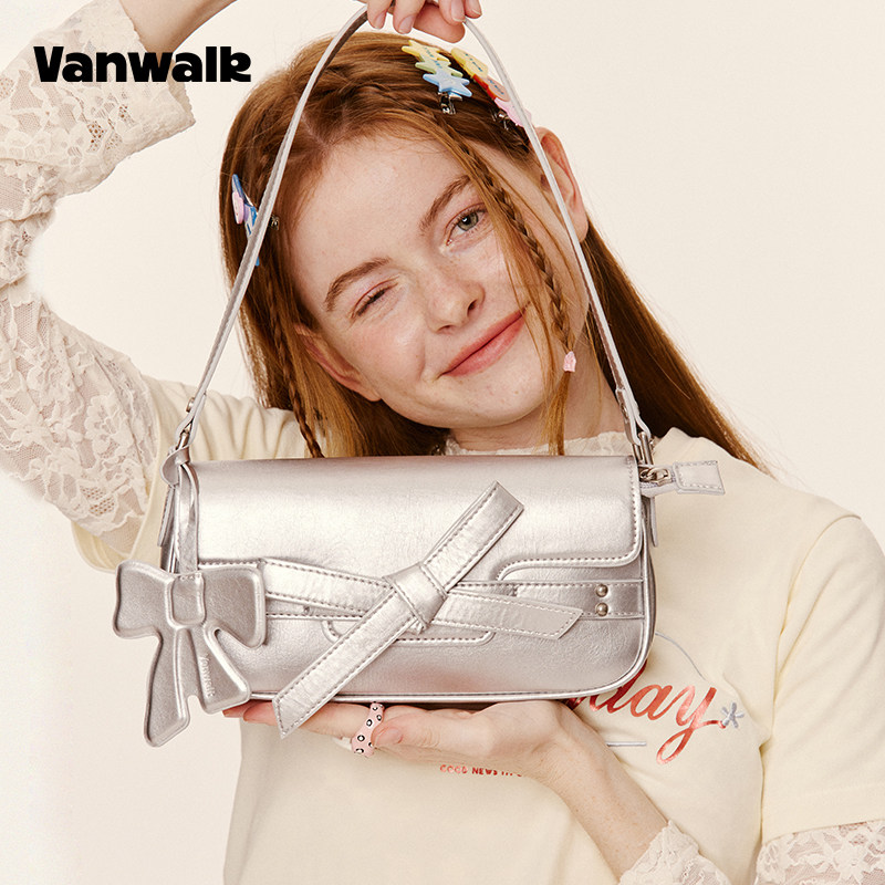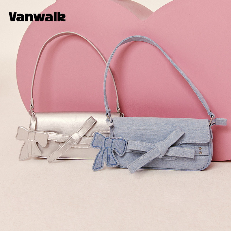VANWALK 新款蝴蝶结少女牛仔法棍包复古休闲小众简约单肩腋下包包