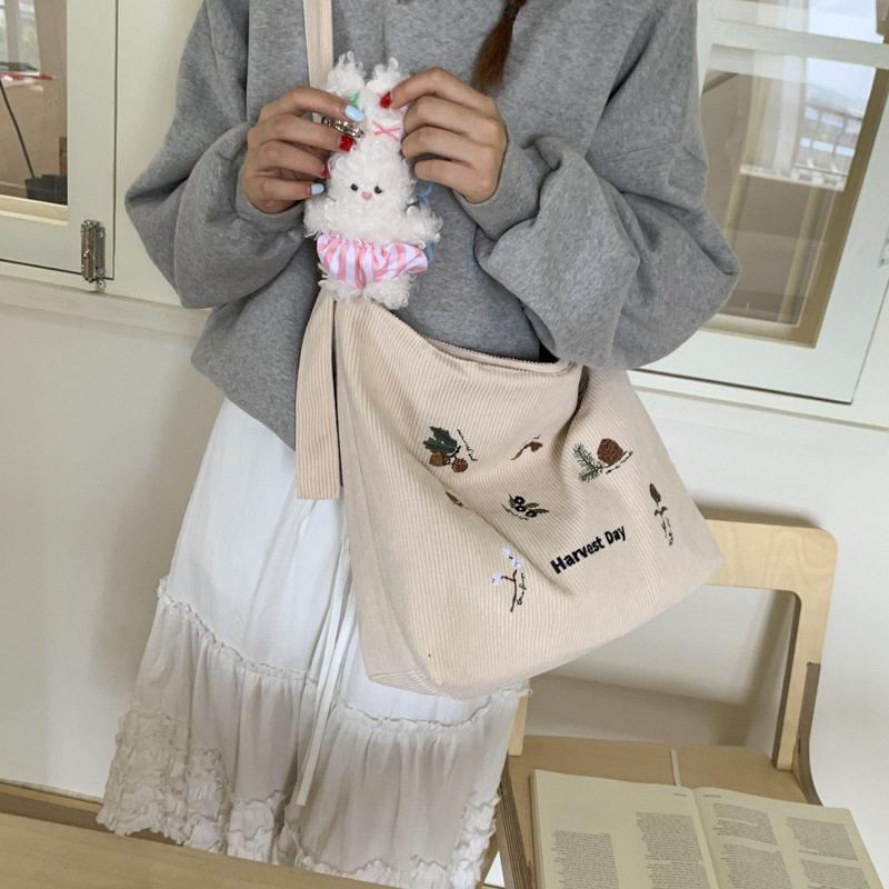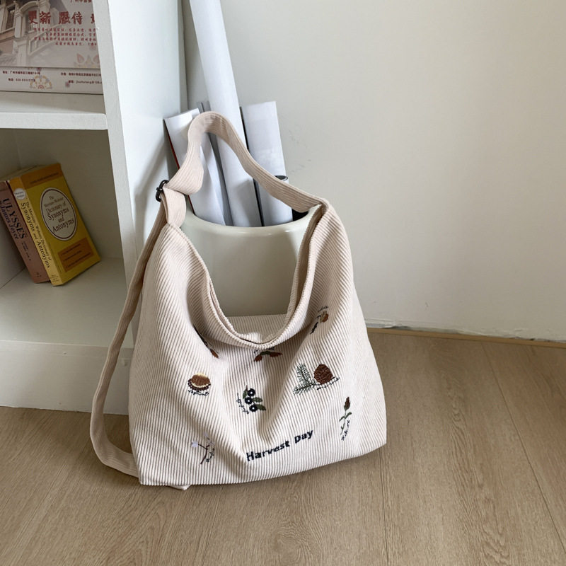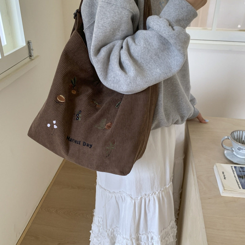 刺绣复古灯芯绒包女新款布包单肩大容量托特包上课通勤斜挎包手提