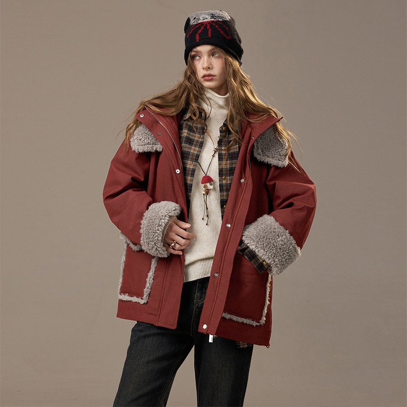 妖精的口袋毛绒大翻领棉衣外套女2025年酒红色工装派克服宽松棉服