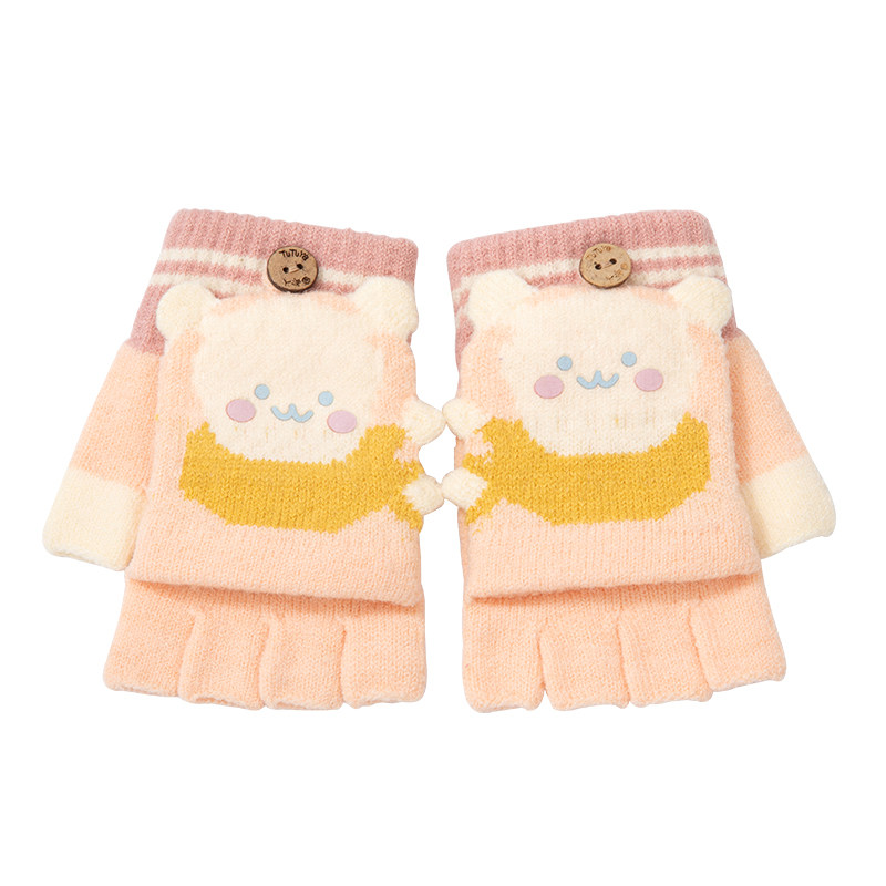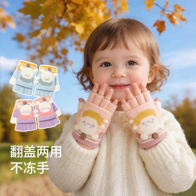 儿童手套半指翻盖冬天季保暖毛绒小学生女孩男童宝宝可爱露指写字