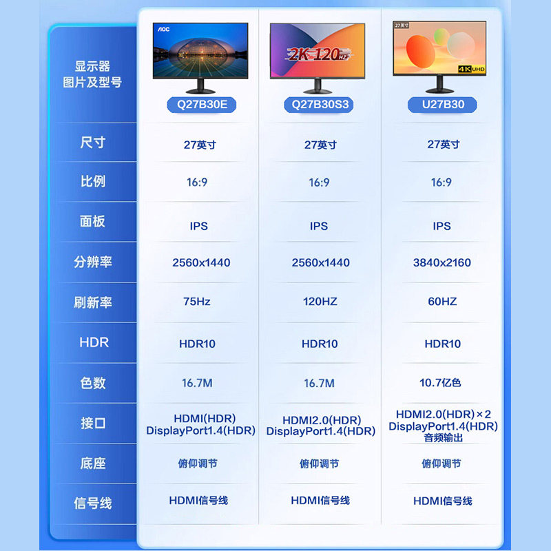 AOC27英寸4K/2K显示器 IPS 低蓝光不闪屏办公设计液晶电脑显示屏
