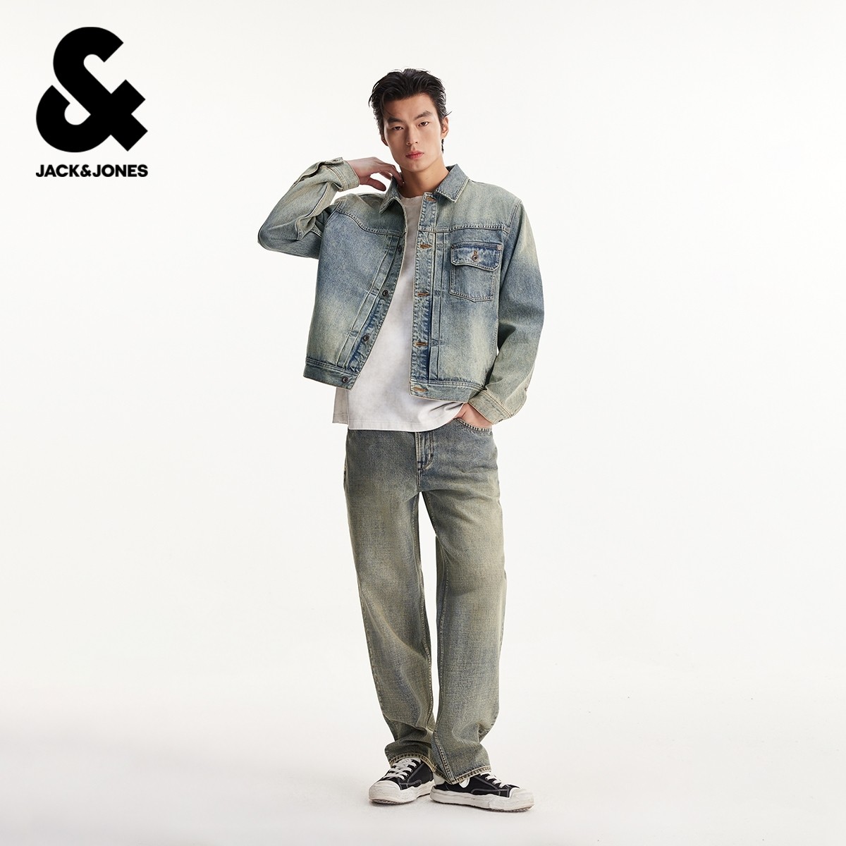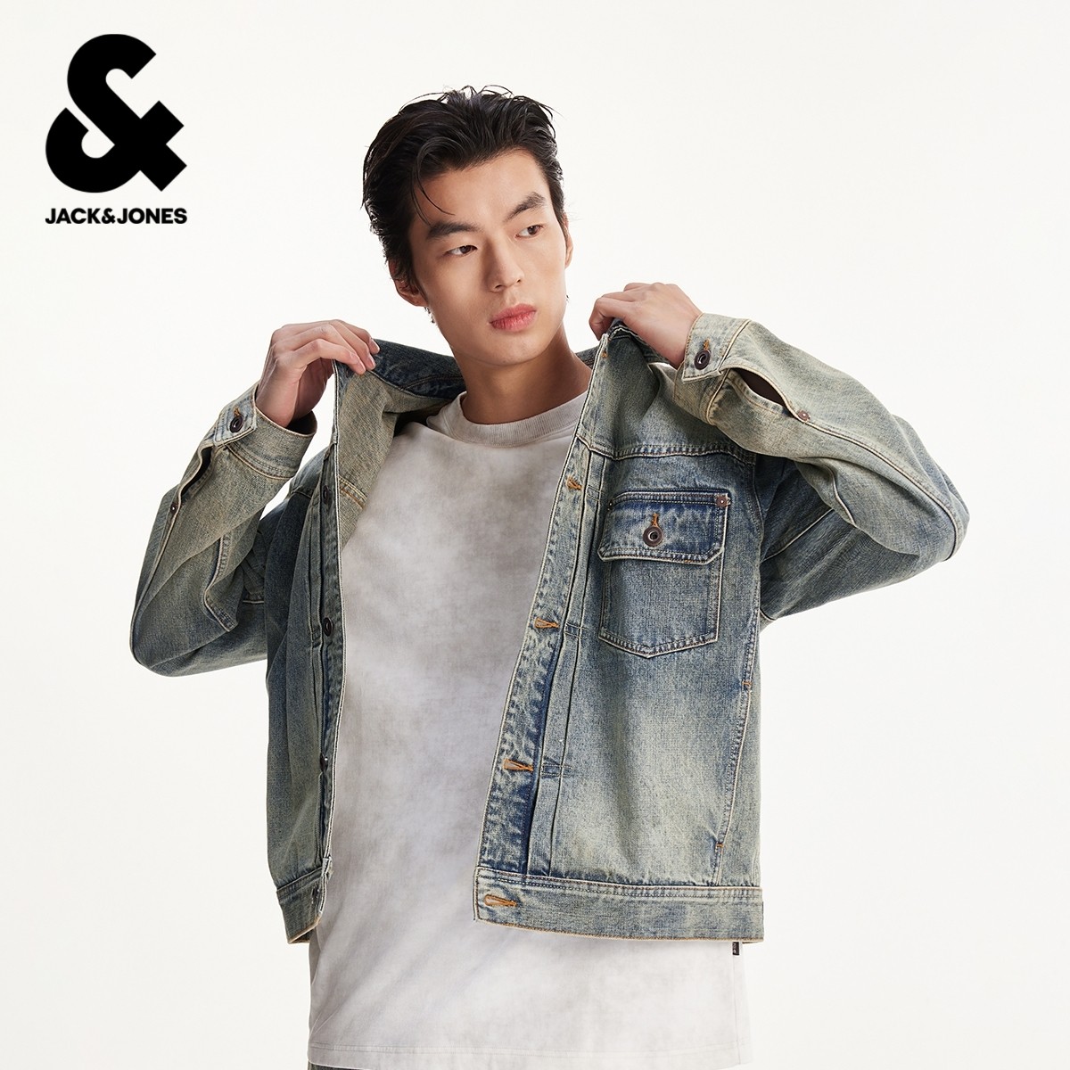 杰克琼斯男装春季夹克外套百搭日常做旧黄泥水洗牛仔休闲翻领宽松