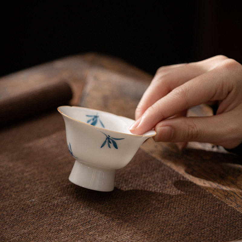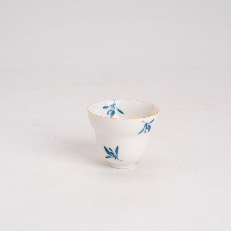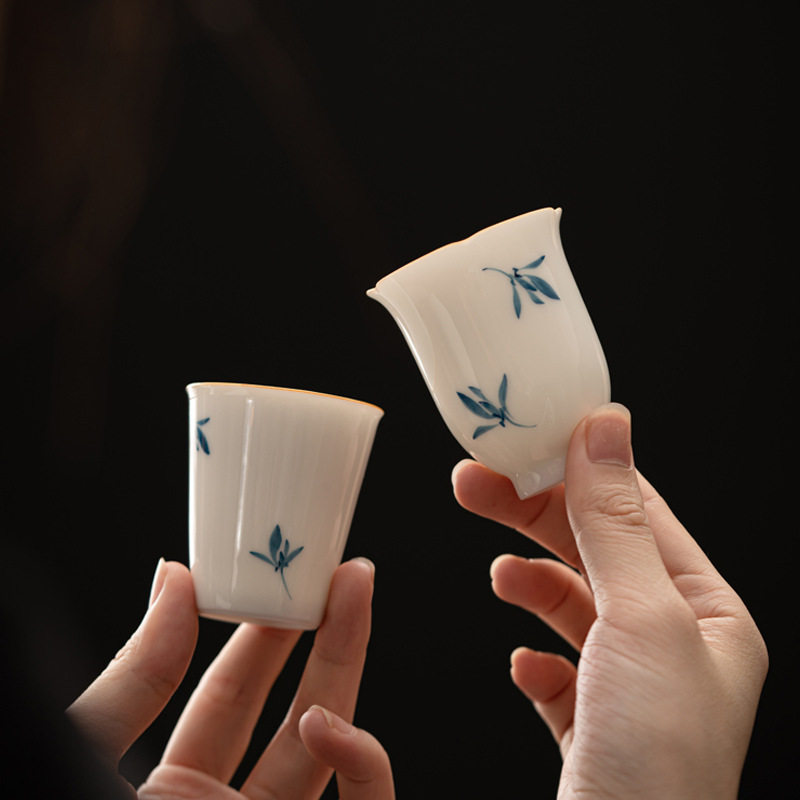 手绘蝴蝶兰茶杯单杯家用品茗杯复古喝茶杯陶瓷功夫茶具甜白闻香杯