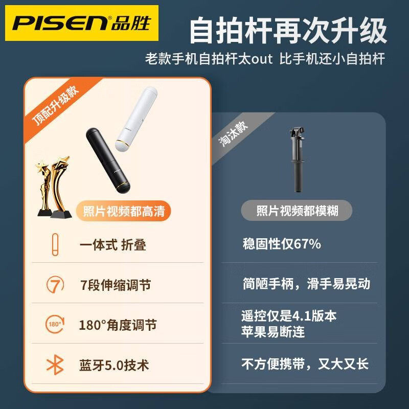 品胜新款迷你自拍杆一体式手持蓝牙遥控拍摄便携超轻手机直播支架vlog防抖云台通用稳定器多功能户外拍照神器