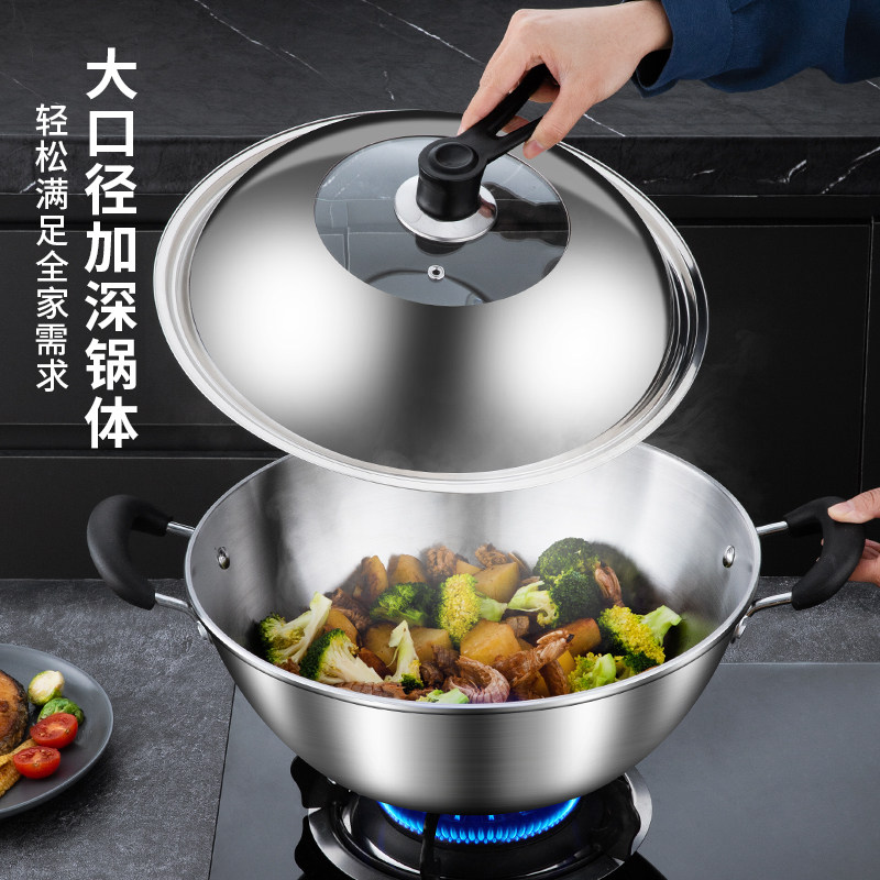 双耳不锈钢炒锅不粘锅家用无涂层平底锅具燃气灶电磁炉炒菜锅专用
