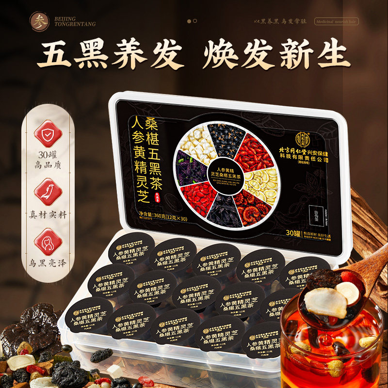 北京同仁堂人参黄精桑葚五黑茶养发乌生黑芝麻熬夜养生茶内廷上用