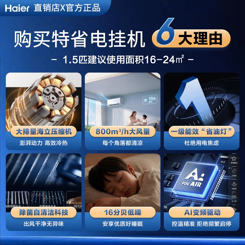 【纯铜管】海尔空调1.5匹1匹家用一级变频冷暖挂机净省电E1旗舰店