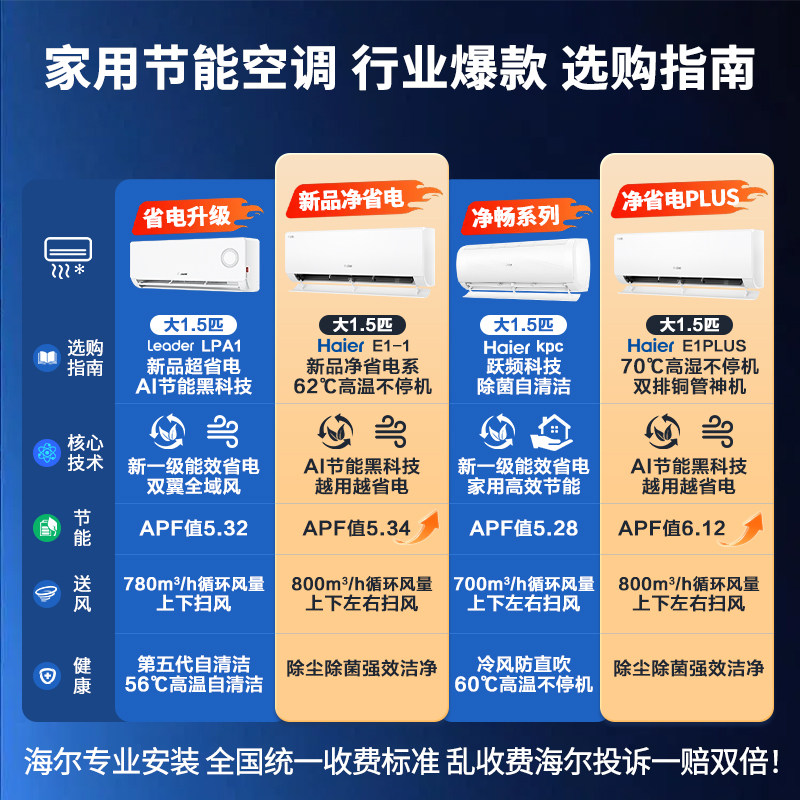 [纯铜管] 海尔空调1.5匹1匹一级变频冷暖挂机家用卧室省电E1官方