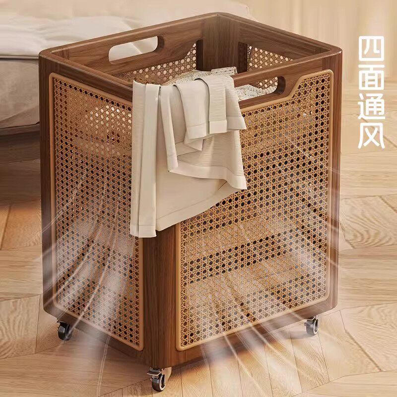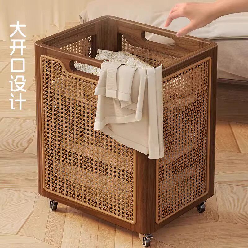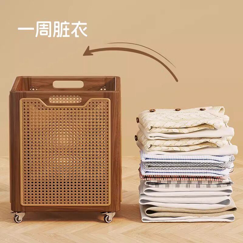实木藤编脏衣篓家用脏衣服收纳筐大容量卧室收纳桶阳台脏衣篮带轮