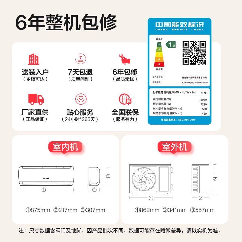 【纯铜管】海尔空调1.5匹1匹一级变频冷暖卧室挂机净省电E1旗舰店