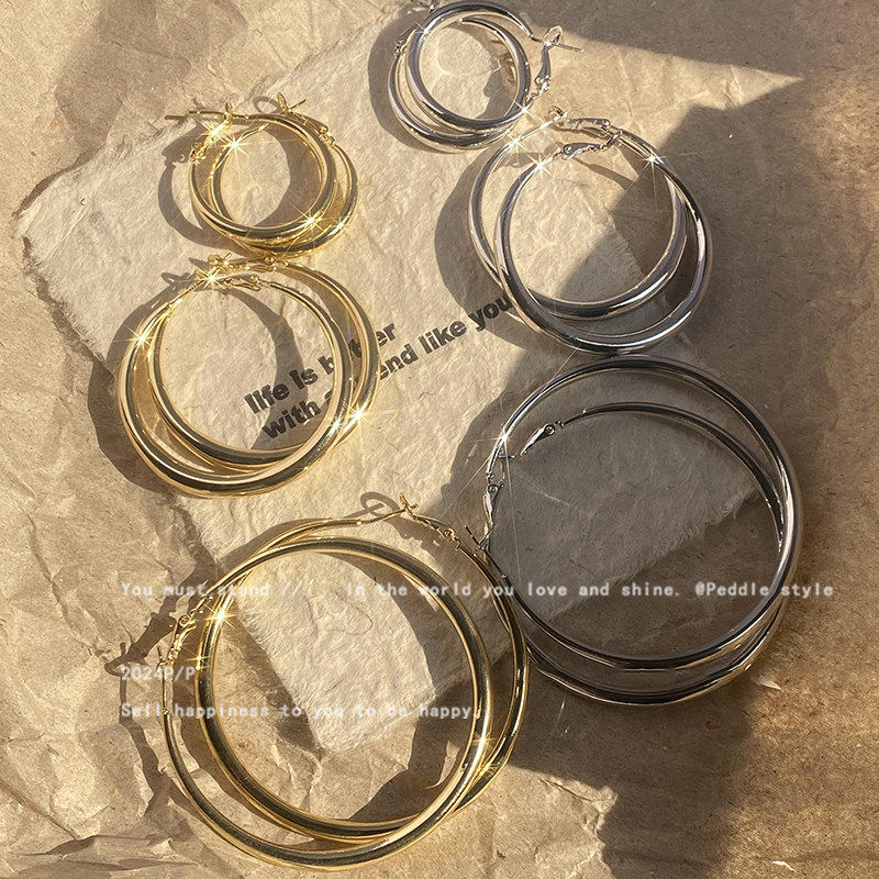 银色素圈大耳圈女款2025新款爆款圆圈耳环轻奢高级方圆脸圈圈耳饰