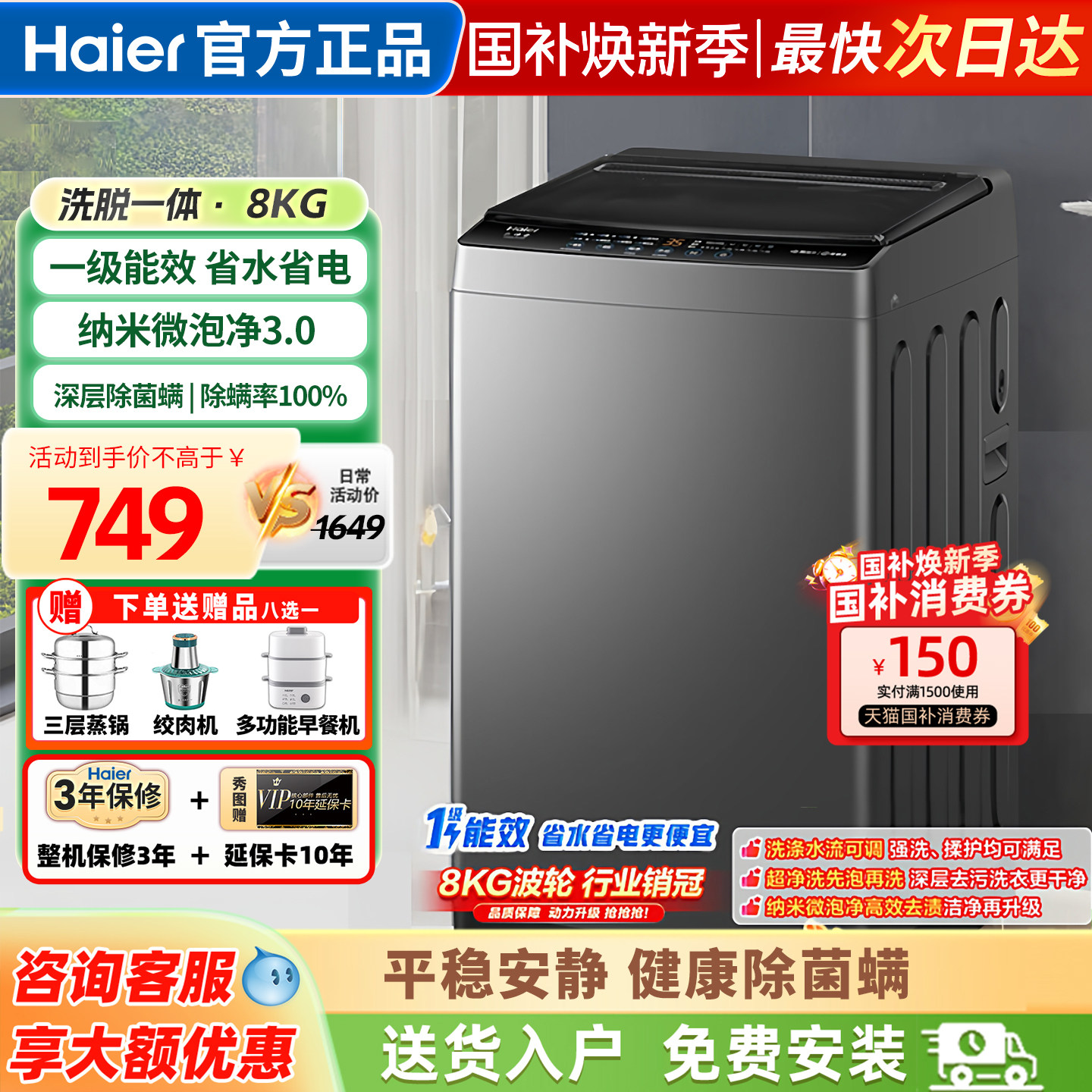 海尔洗衣机全自动家用波轮8kg8公斤一级变频