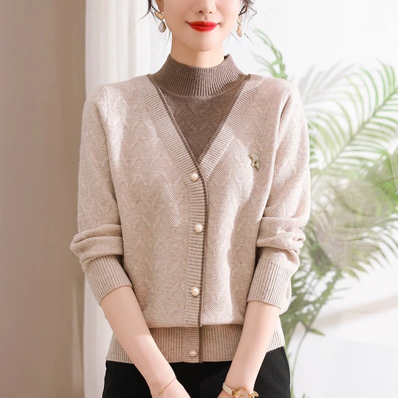 中年妈妈春装新款毛衣女春秋冬加绒加厚中老年人假两件长袖打底衫