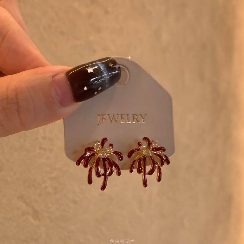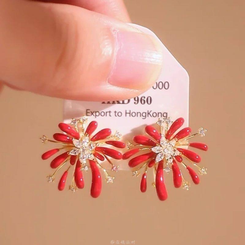 烟花叙年!超闪耀红色烟花锆石耳钉女轻奢高级感秋冬显白耳环耳饰