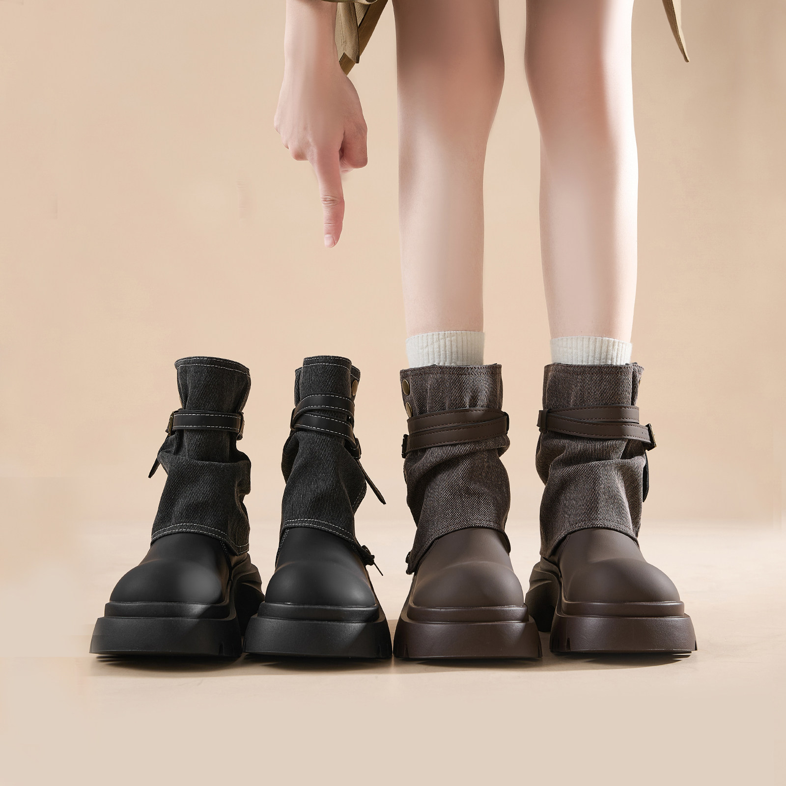 羊皮版~内增高靴子女2025新款爆款中筒粗跟短靴卡其色褶皱堆堆靴
