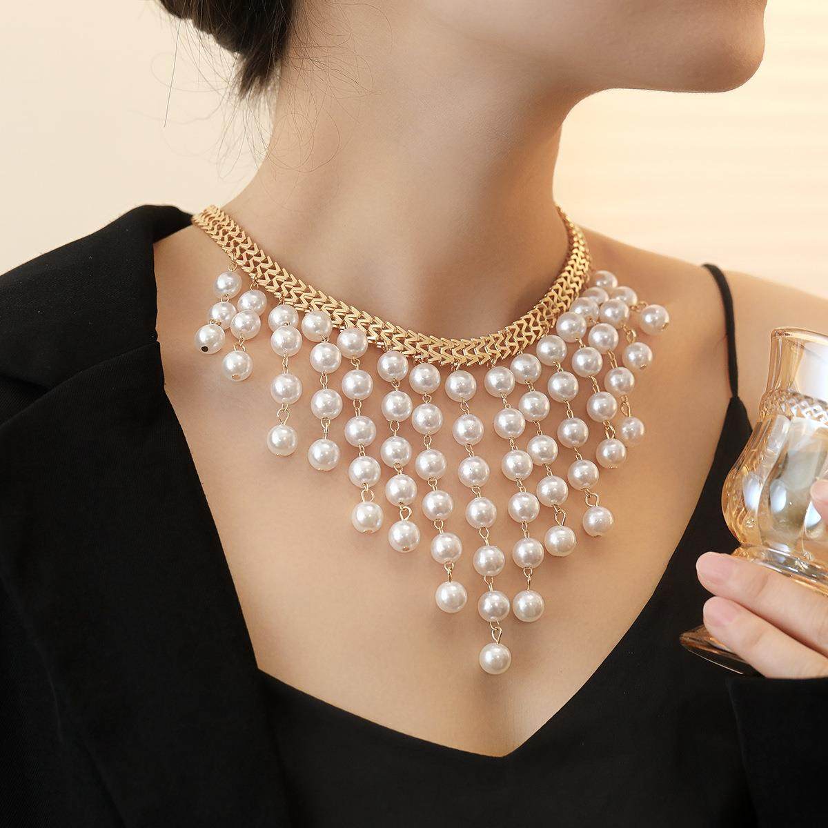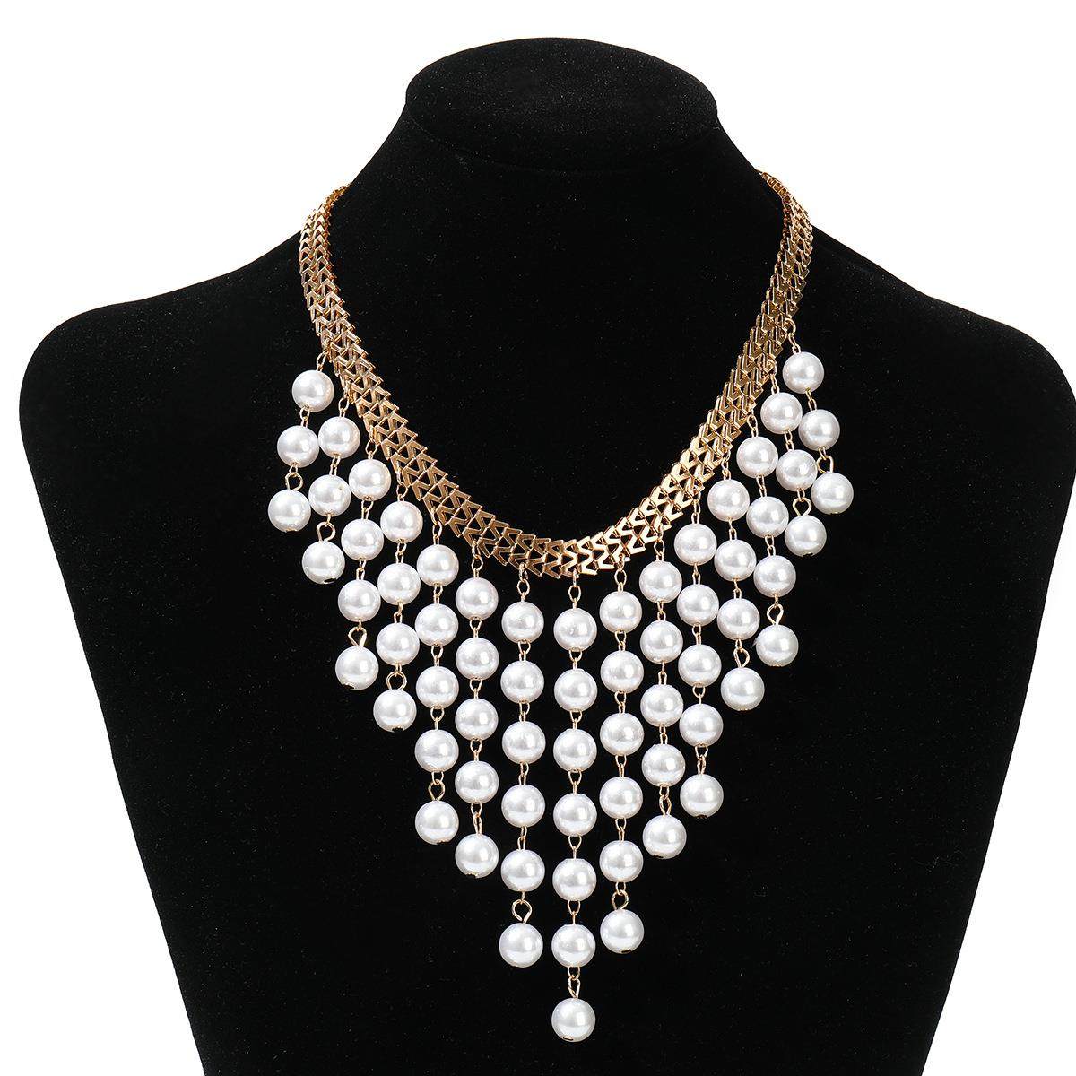 欧美跨境饰品 多层长款珍珠流苏项链 新款夸张设计珍珠围兜项链