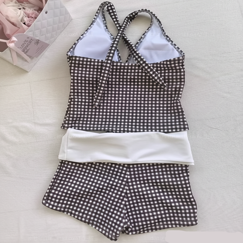 泰国性感辣妹格子挂脖比基尼系带分体泳衣时尚显瘦温泉度假两件套
