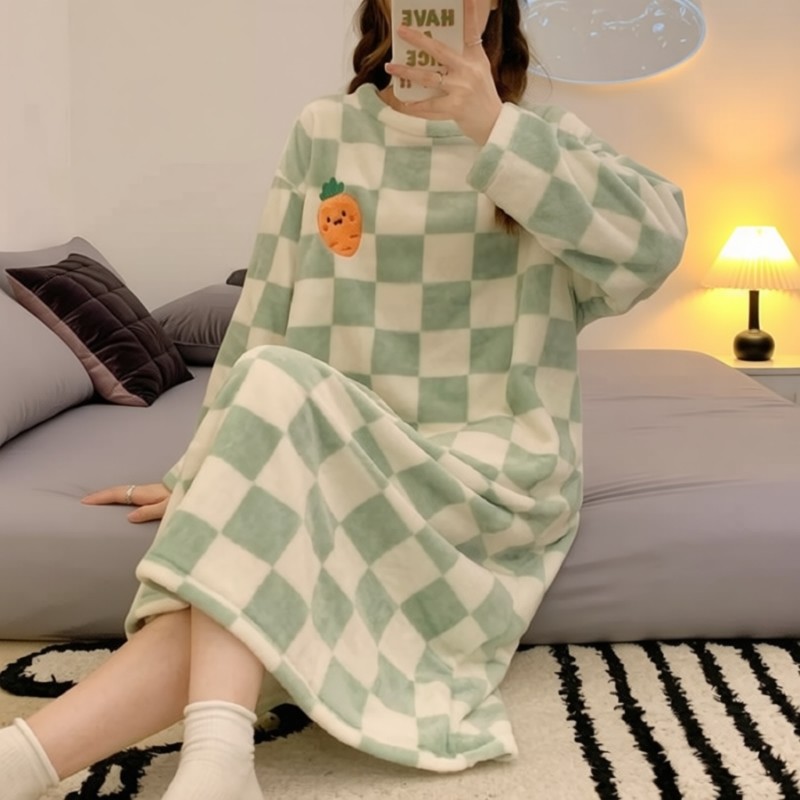 新款睡裙法兰绒女冬季长袖睡衣珊瑚绒休闲网红风格子女学生家居服