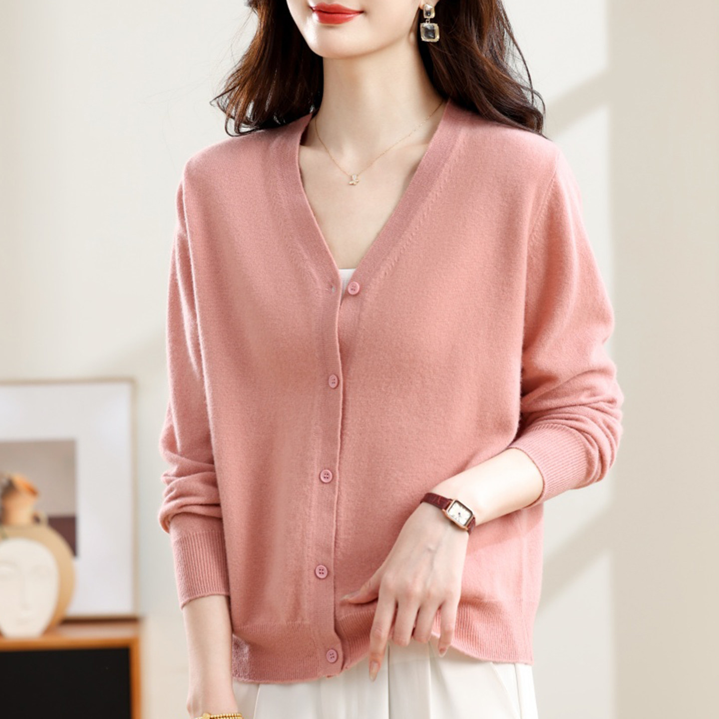 反季清仓春秋新款V领羊绒开衫女外搭纯色大码毛衣打底针织衫外搭