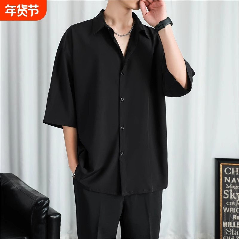 黑色衬衫男长袖夏季宽松高级垂感痞帅休闲冰丝短袖黑衬衣大童外套