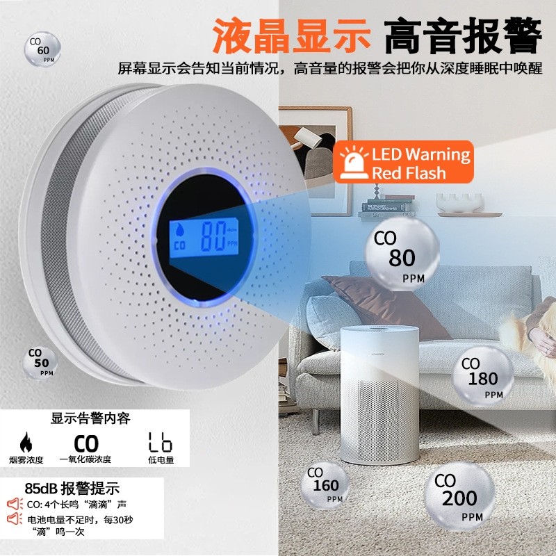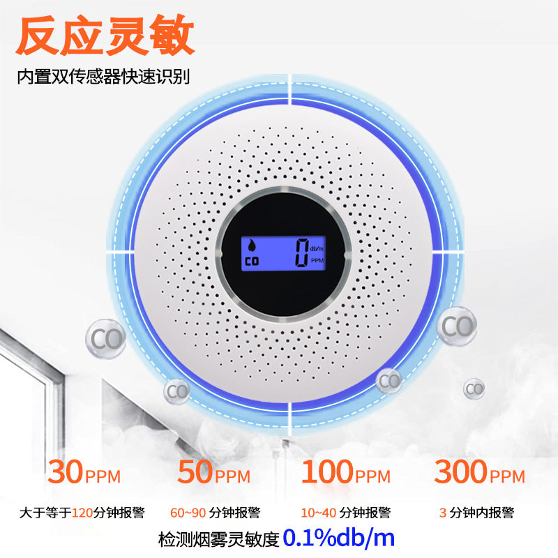 复合烟雾一氧化碳报警器电池款跨境外贸双功能CO气与烟雾探测批发