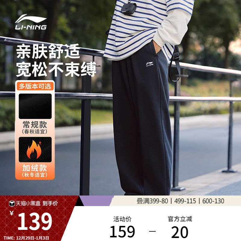 李宁卫裤男士宽松休闲裤健身跑步长裤拉链口袋加绒针织黑色运动裤