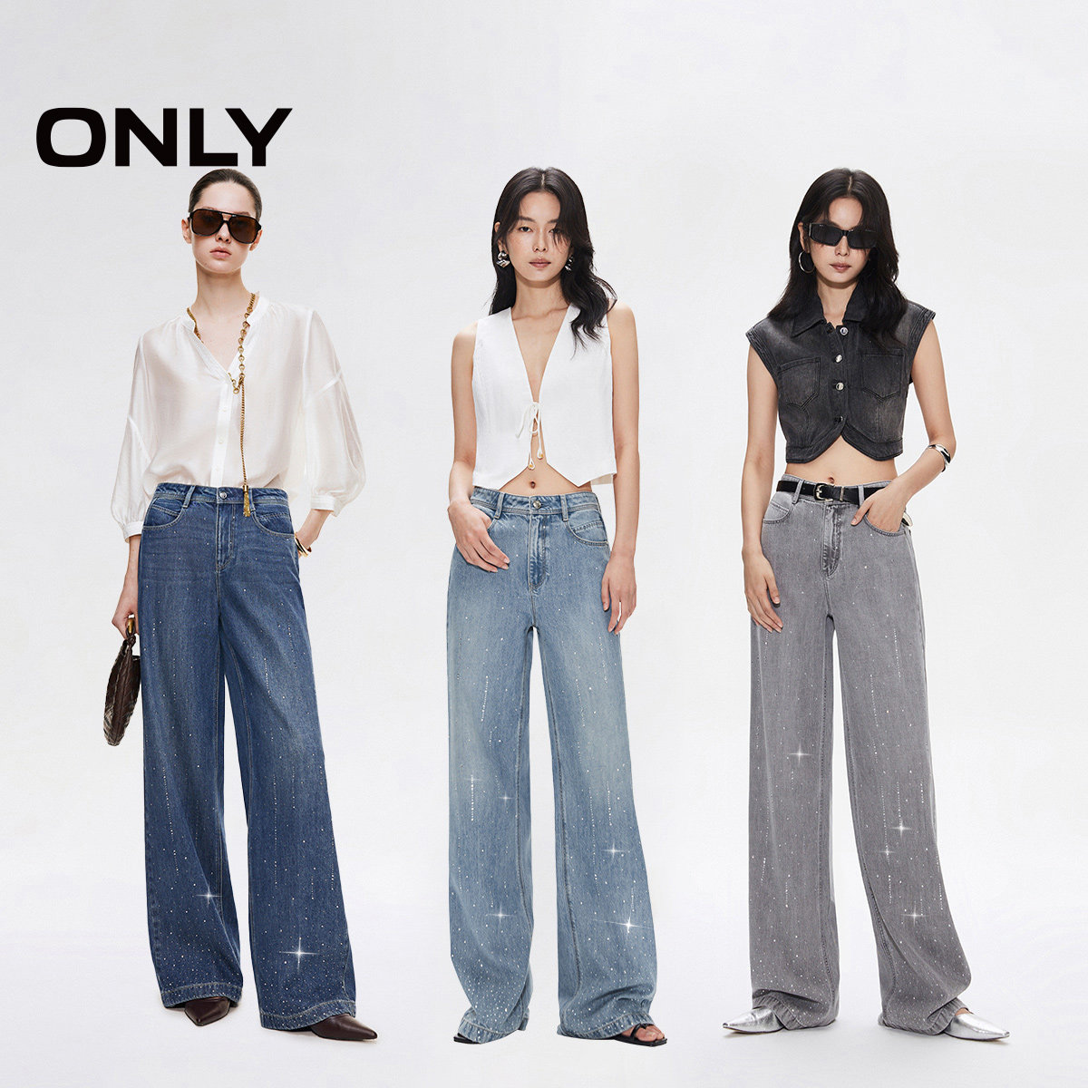 【流星裤】ONLY2026春季新款面料升级闪耀烫钻高腰宽松直筒牛仔裤