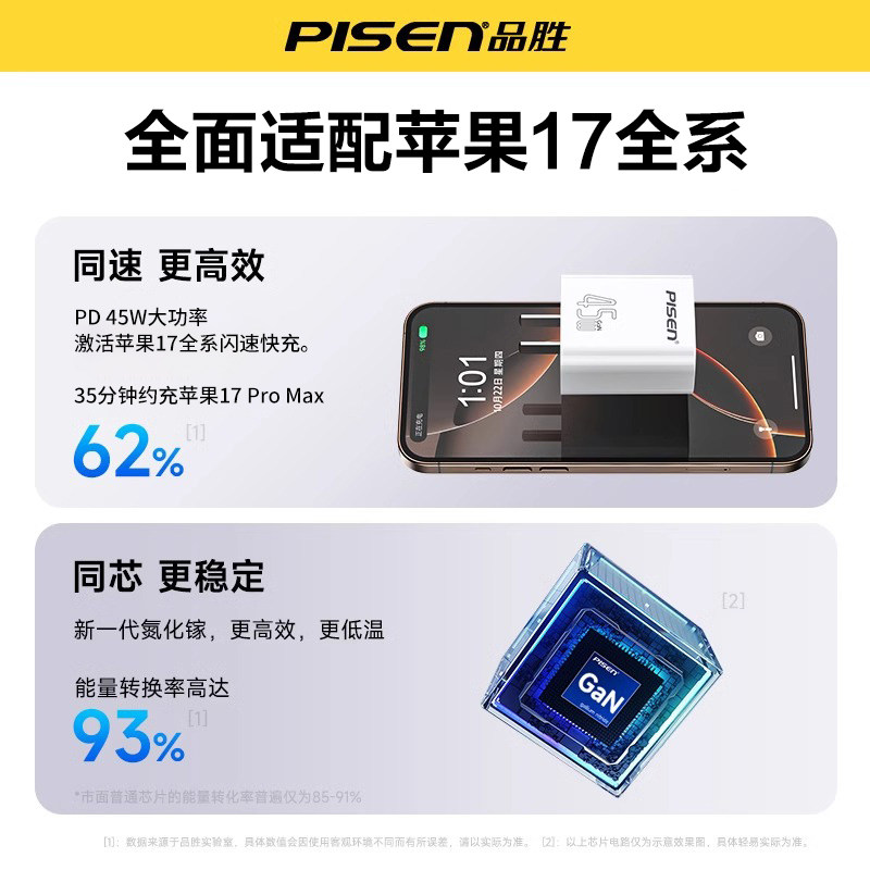 品胜45W充电头适用苹果17/16充电器iPhone16promax15快充头40W充电器氮化镓手机typec数据线平板充电器头通用