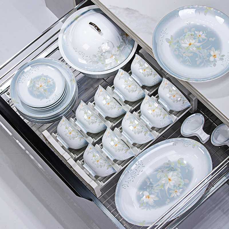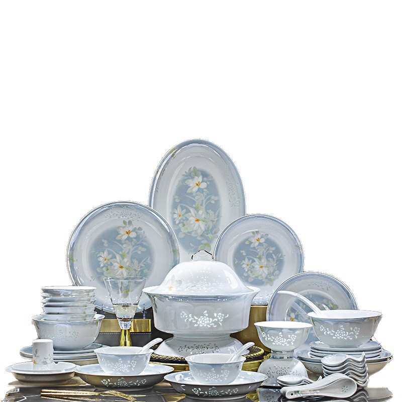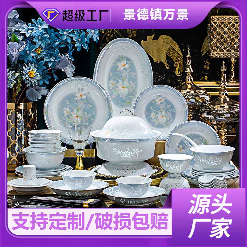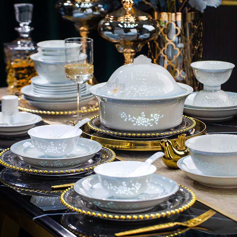 景德镇陶瓷饭碗家用高温釉下彩盘子菜盘中式餐具套装白色玲珑瓷器