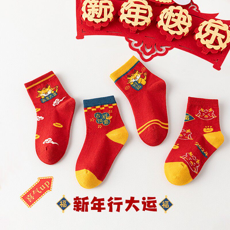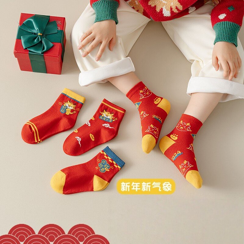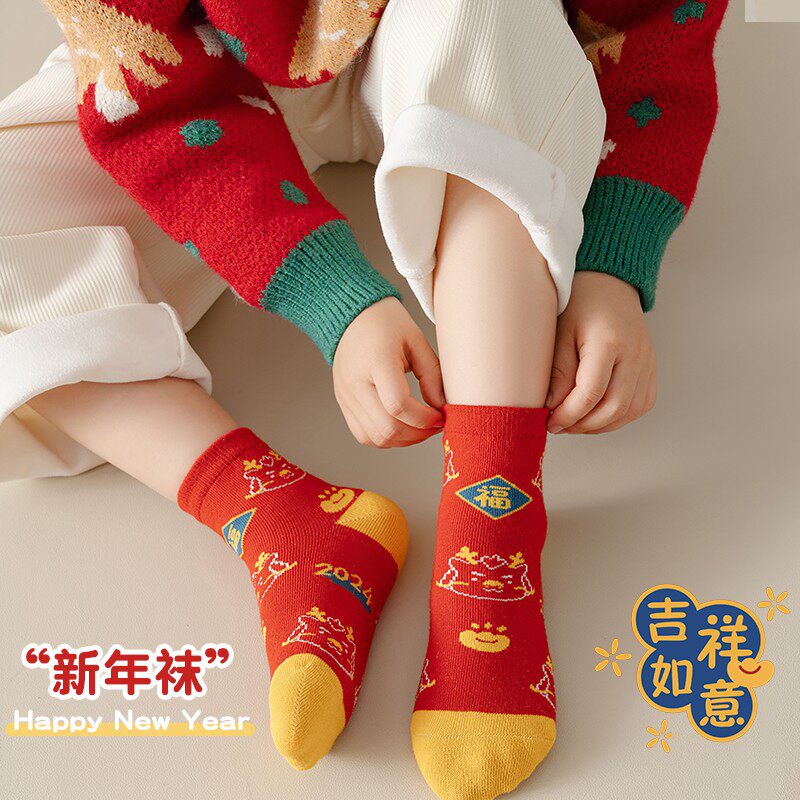 儿童袜子新年大红袜喜庆中筒袜秋冬卡通保暖学生卡通袜红色不勒腿