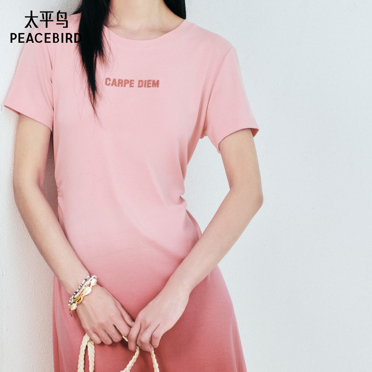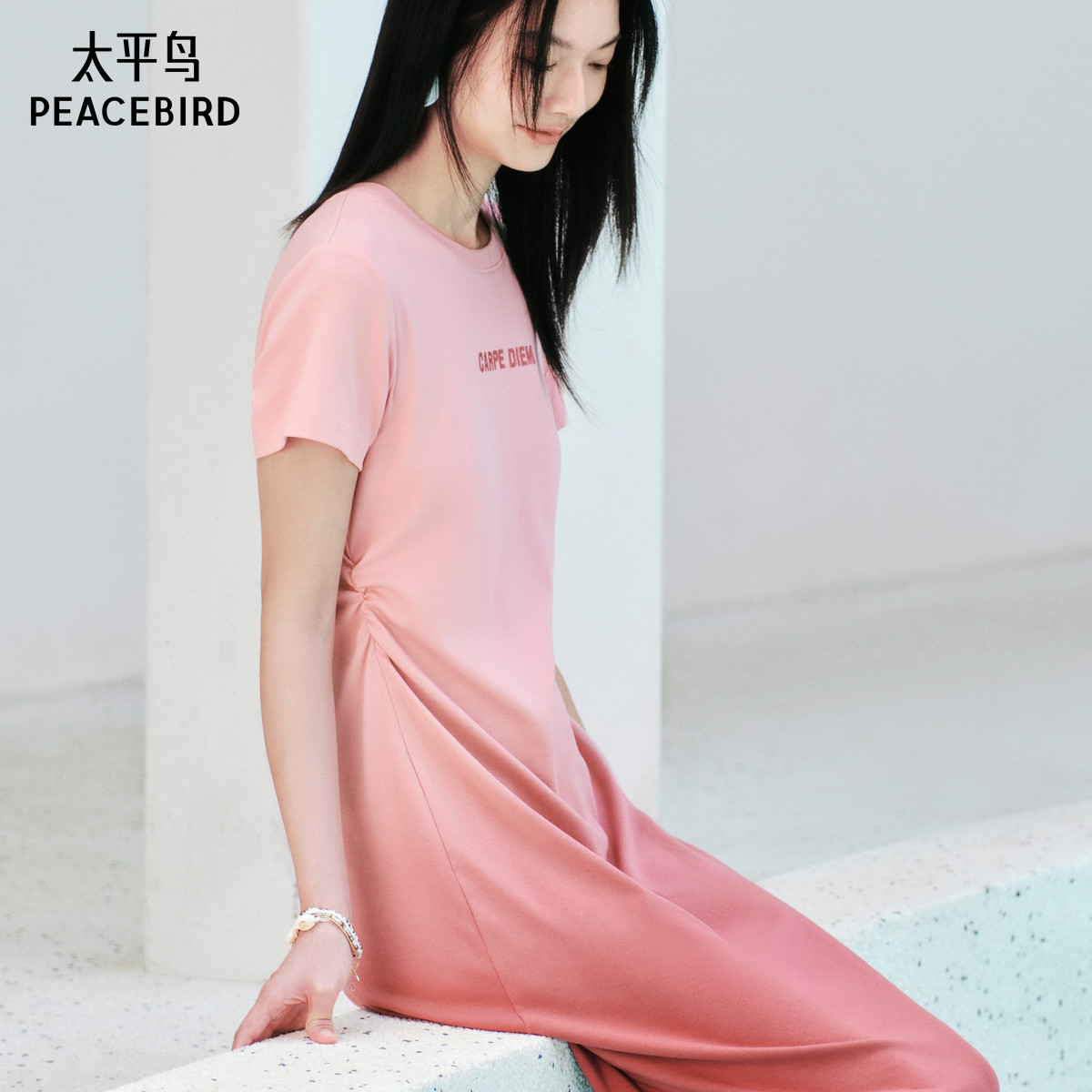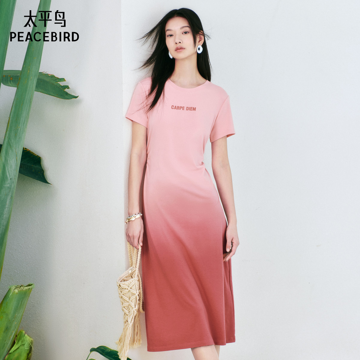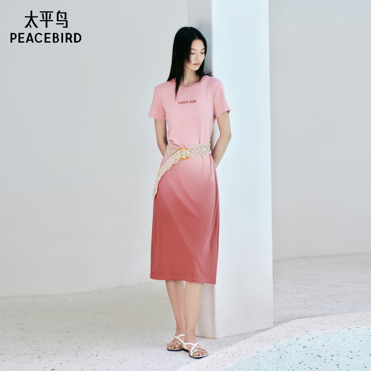 太平鸟渐变T恤裙短袖连衣裙2025夏季新款字母刺绣圆领A字显瘦长裙