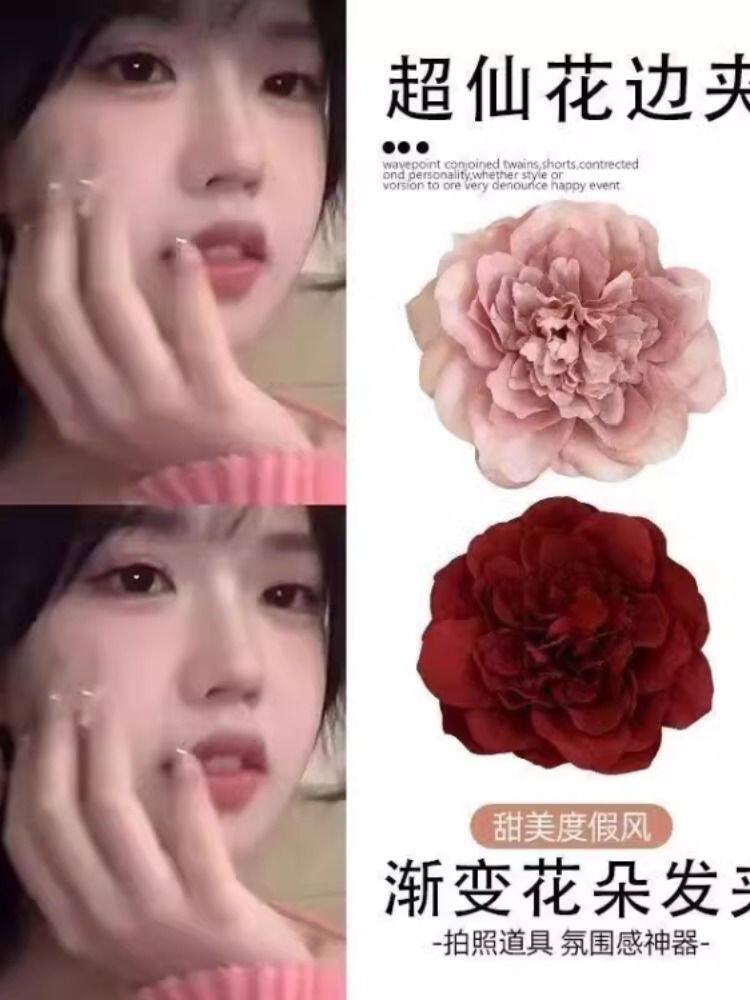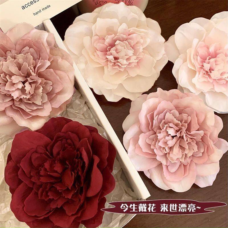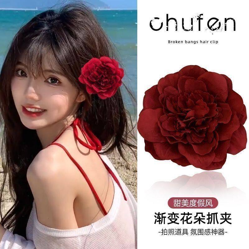 海边日落拍照发饰红色牡丹花朵发夹侧边夹子刘海夹头花发卡头饰女