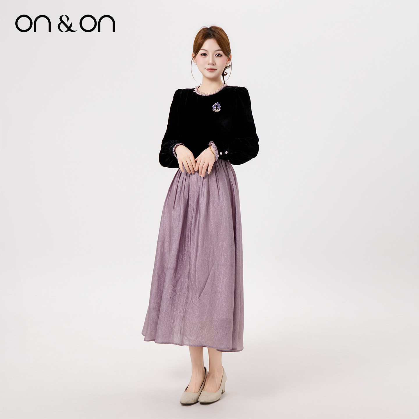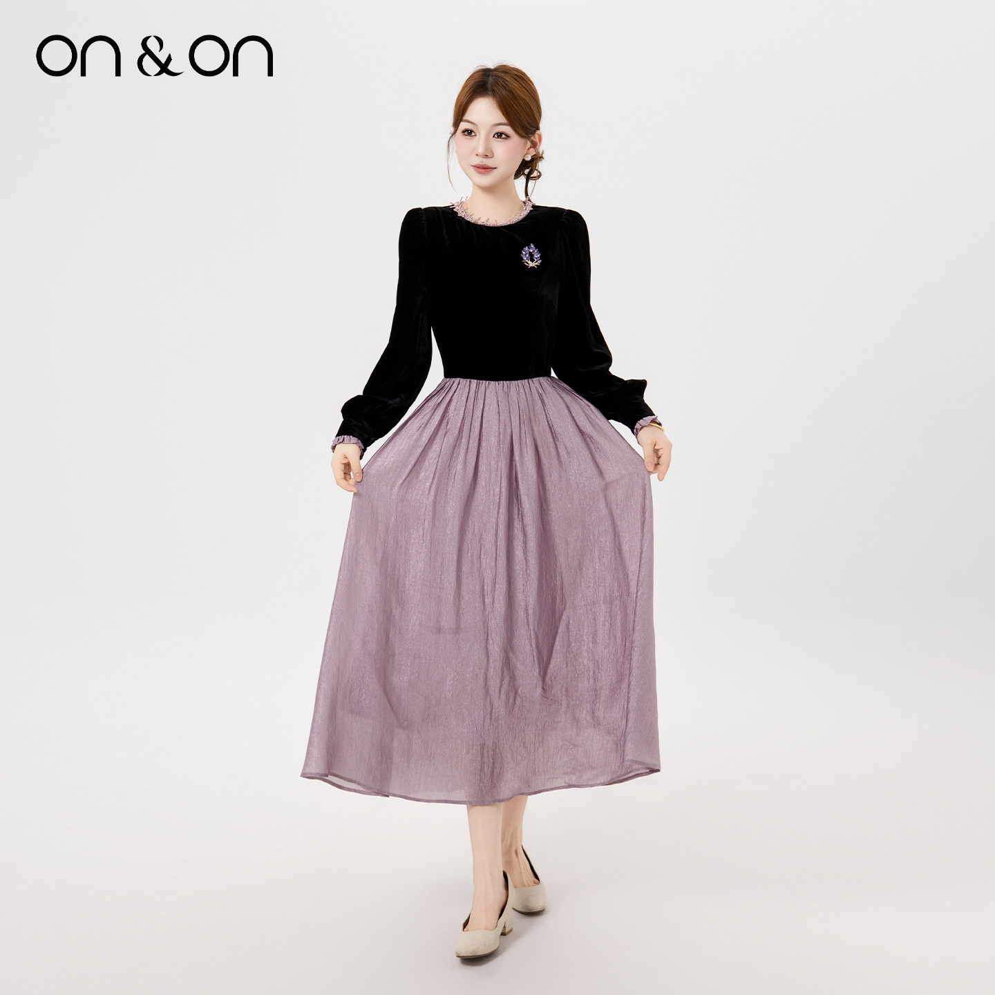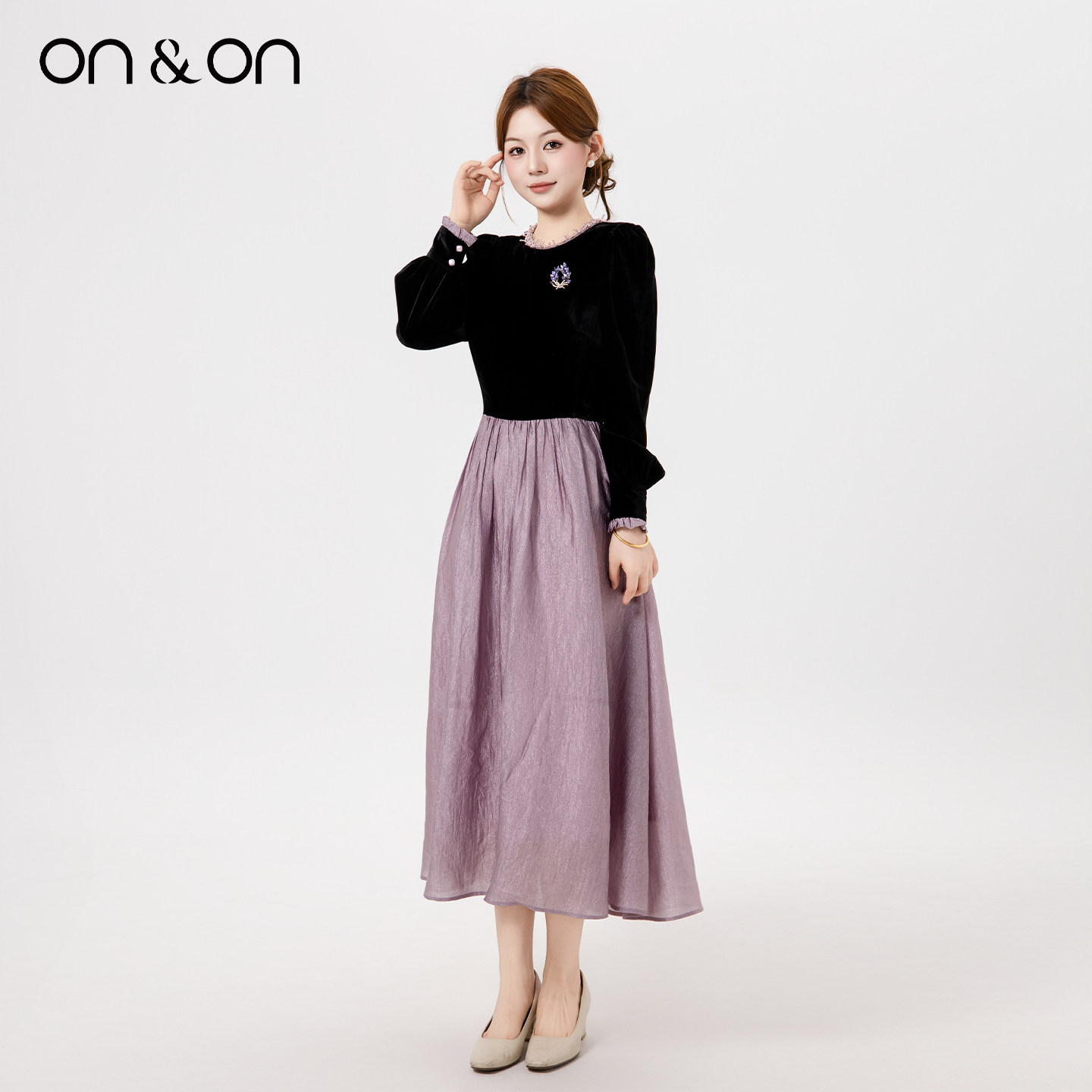 ON&ON/安乃安2025冬季新款法式复古轻奢钉珠拼接撞色加绒连衣裙