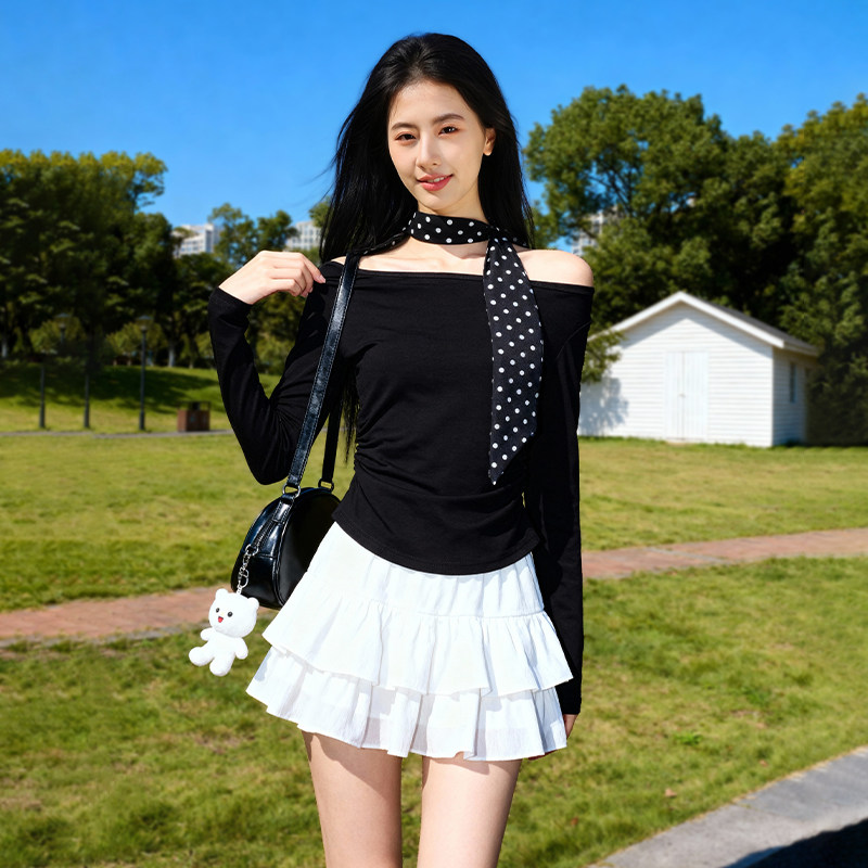 NOW真维斯黑色一字肩长袖t恤2026新款春秋修身小众设计感露肩上衣