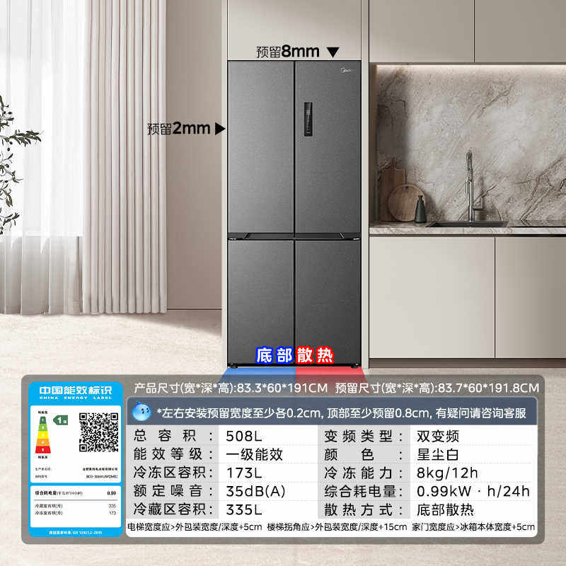 【政府补贴】美的508L十字四开门60cm超薄零嵌入双开家用无霜冰箱