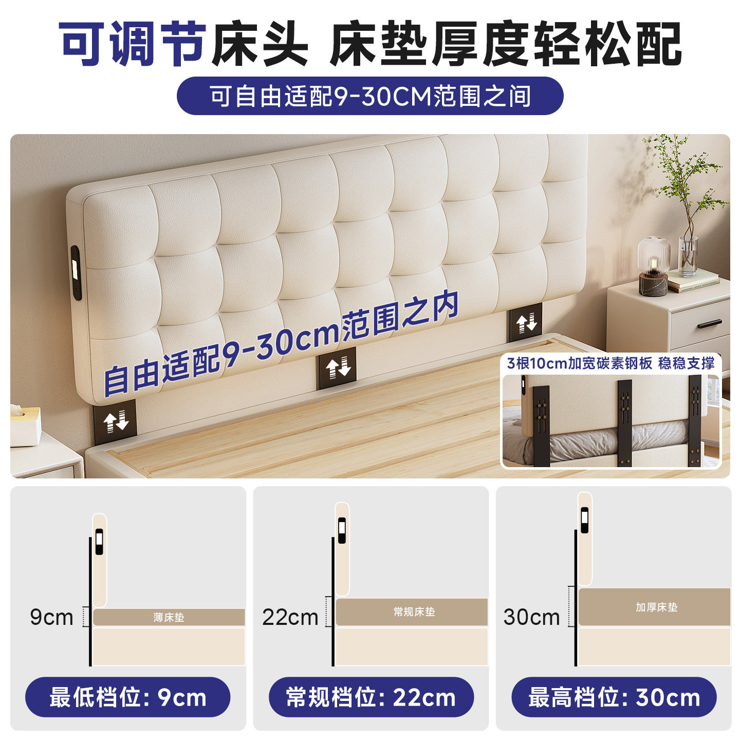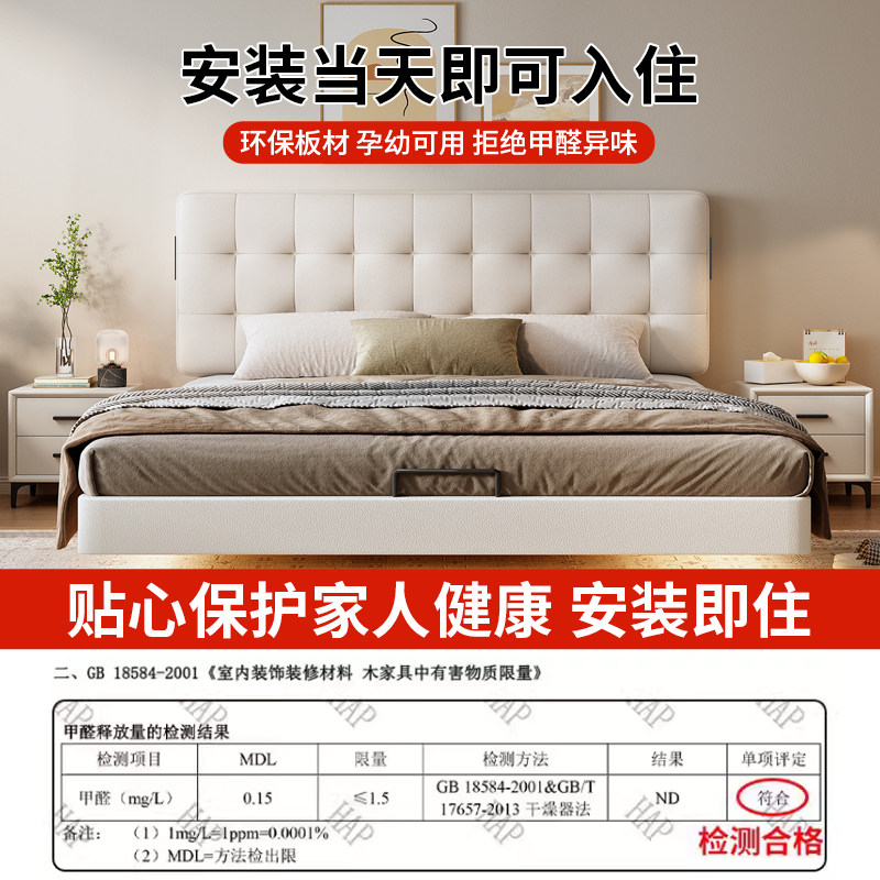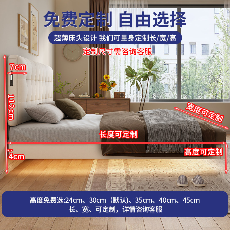 奶油风华夫格实木静音床小户型可调节薄床头悬浮双人床可定制尺寸