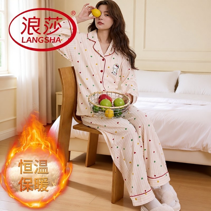 浪莎睡衣女秋冬季德绒长袖毛绒厚款甜美可外穿家居服两件套装睡眠