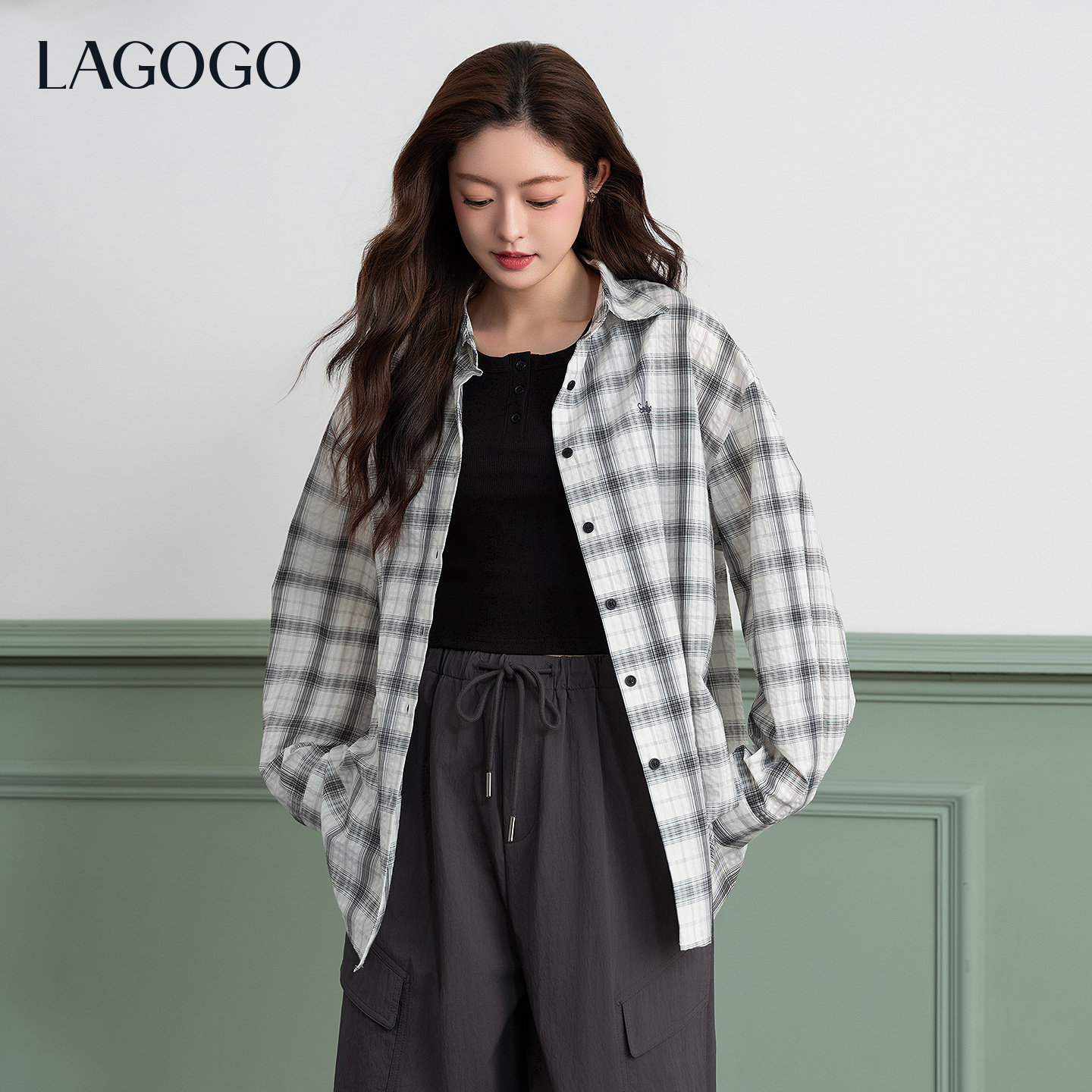 LAGOGO定格胶片韩系黑白格子衬衫女拉谷谷2026春新款纯棉宽松上衣