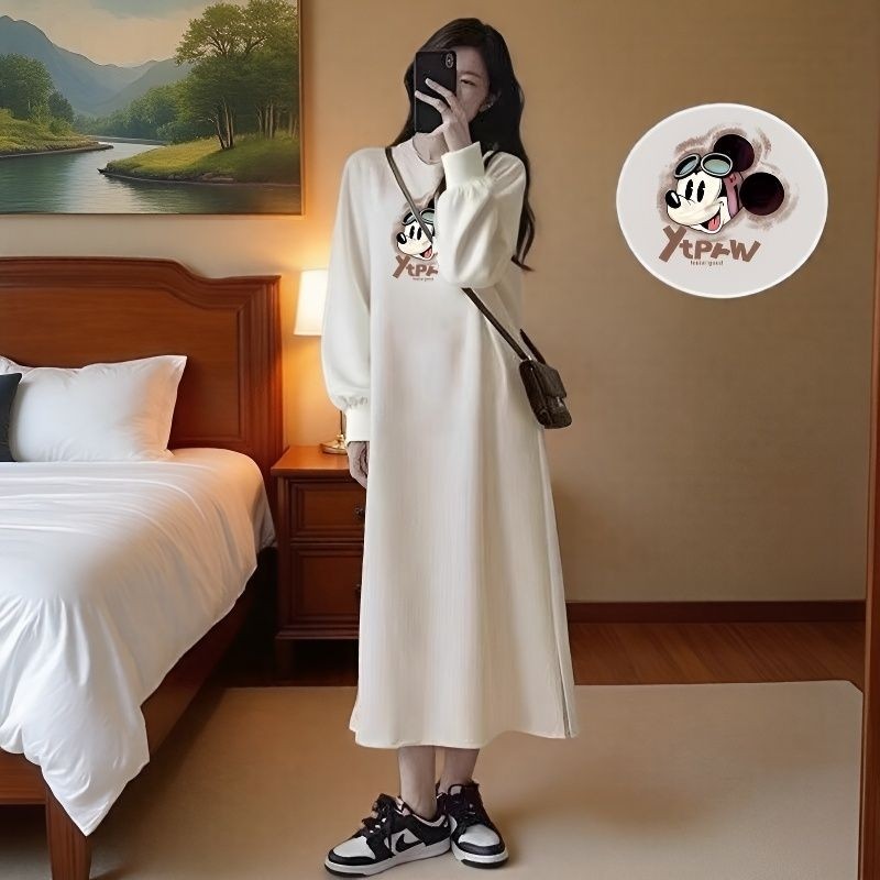 孕妇装连衣裙秋冬季侧开叉纯棉长袖T恤裙孕妇裙宽松大码遮肚子
